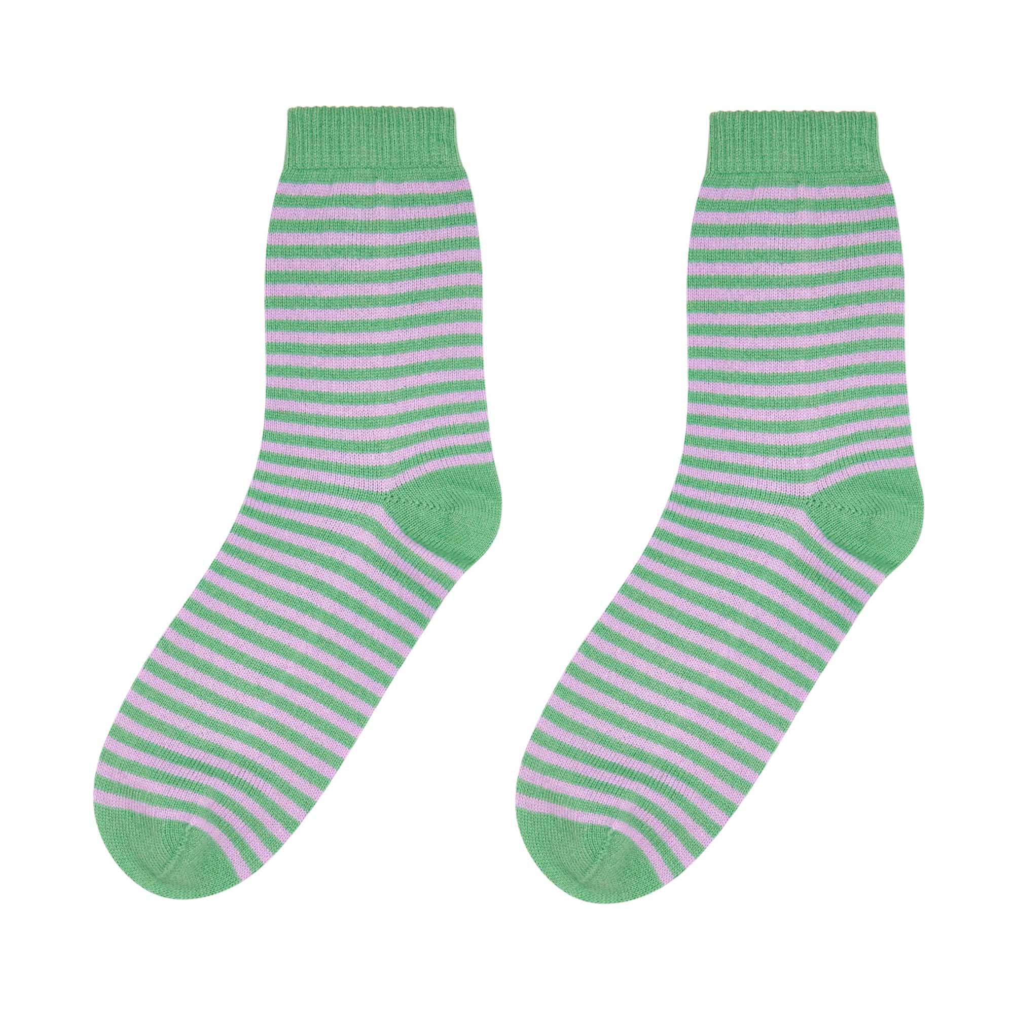 Jumper 1234 cashmere socks. Cashmere 'bed' socks in green and lilac stripes. There are matching hats AND jumpers and 4 colourways to choose from! Remember as ever these socks are not to be worn with shoes!