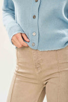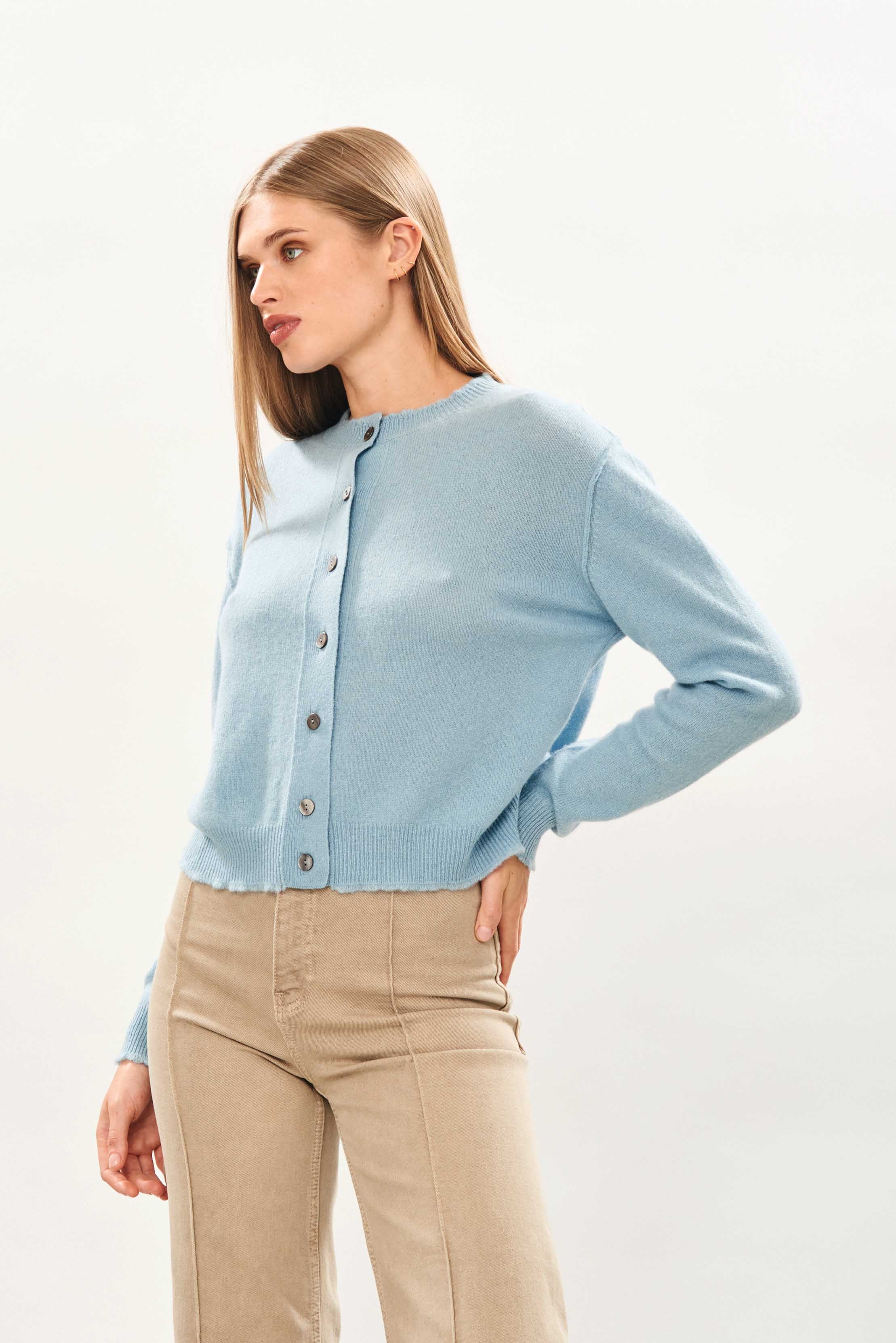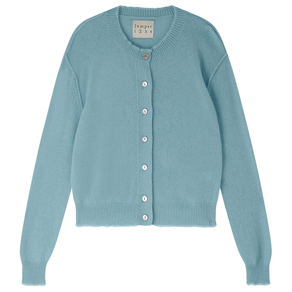 Jumper 1234 cashmere cardigan. Blue cashmere crew neck cardigan with 'distressed' ribs. Another new additions to our 'distressed' offer, available in 8 colours with matching tanks too. It's true to size and even if we say so ourselves a great update to a classic cardigan! Part of our core collection, those jumpers and cardigans in plain and stripe that you also need, but can't always find!
