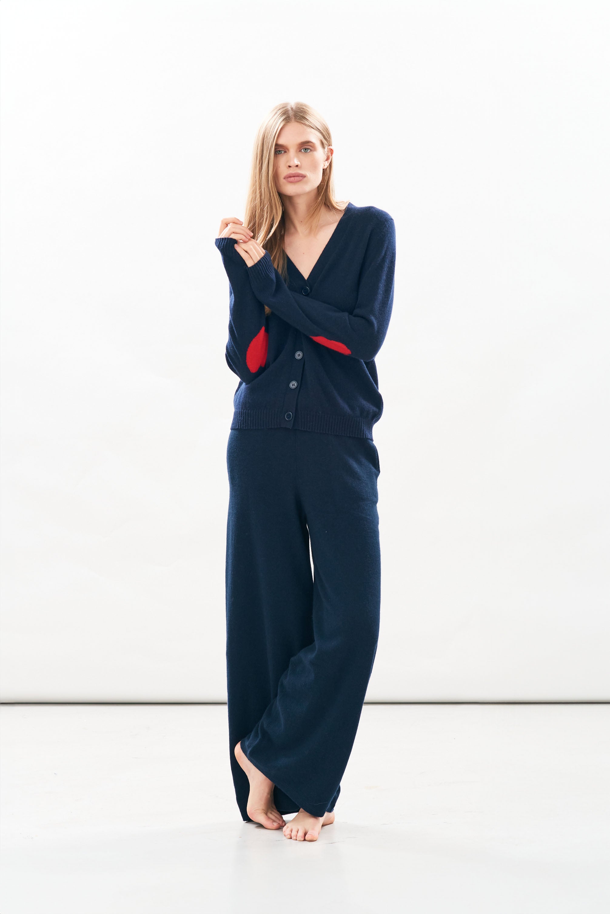 Jumper 1234 cashmere cardigan. Navy vee neck cashmere cardigan with red heart intarsia elbow patches. Classic fit and also available in oatmeal with hot pink intarsia elbow patches. Heaven in a cardigan?