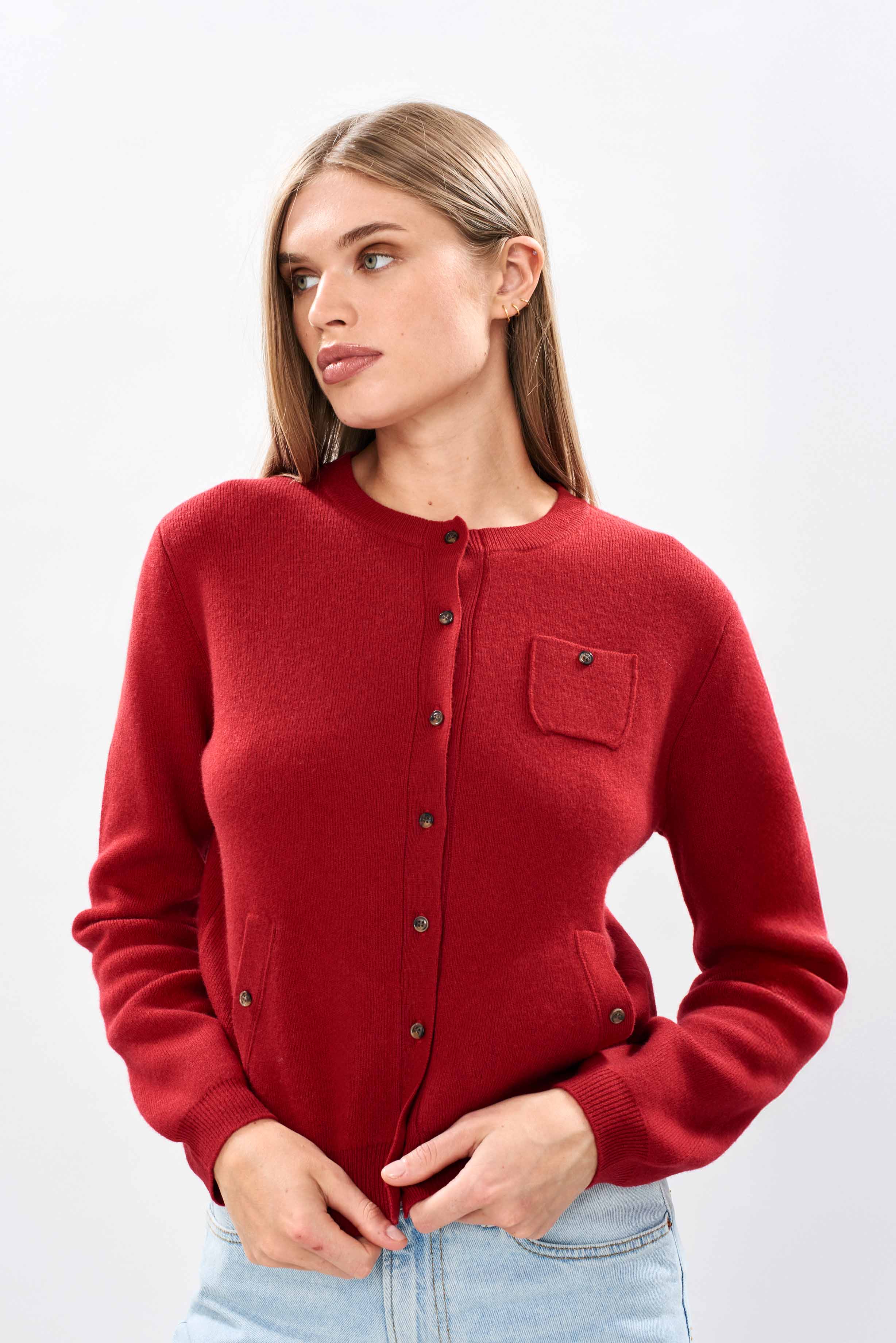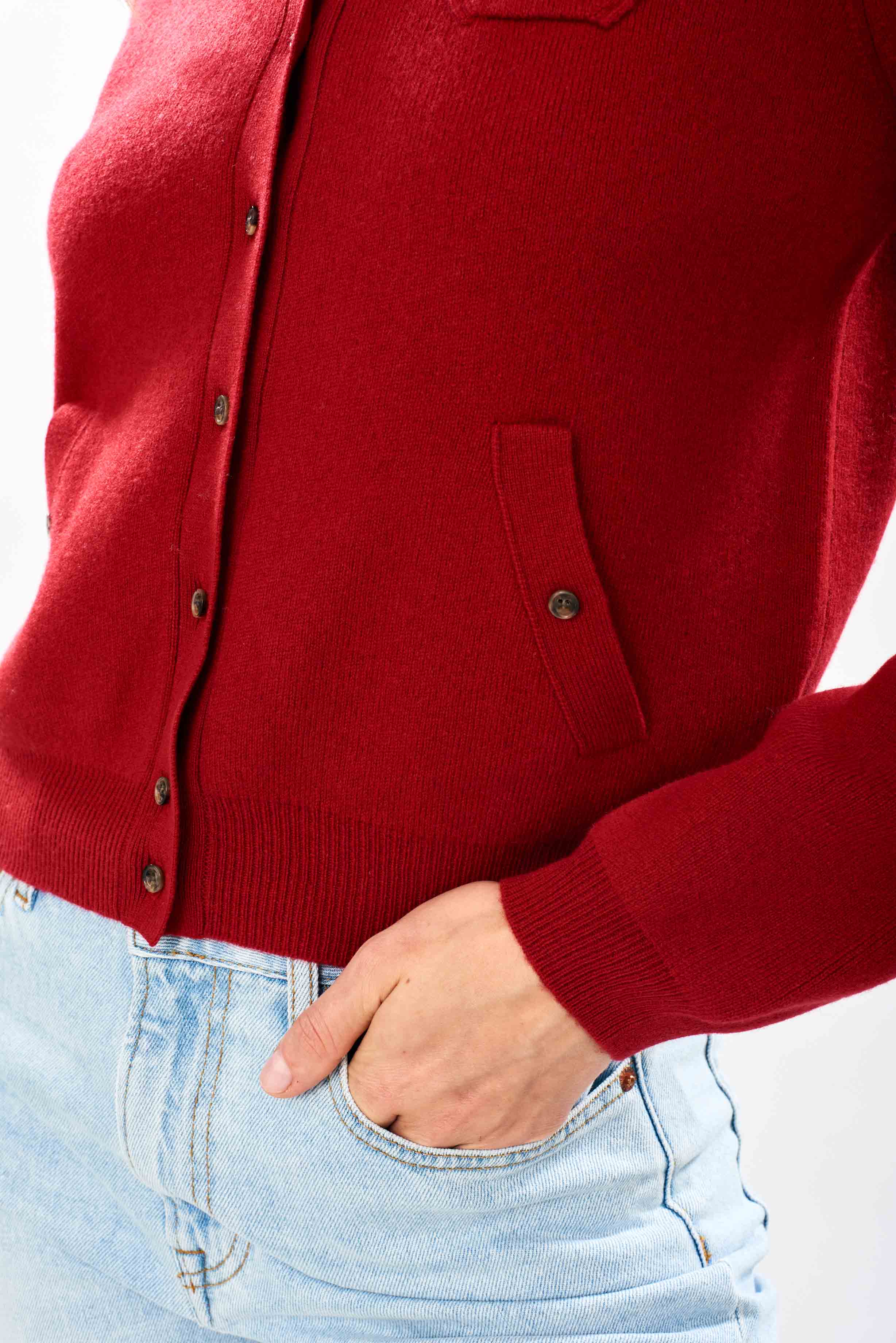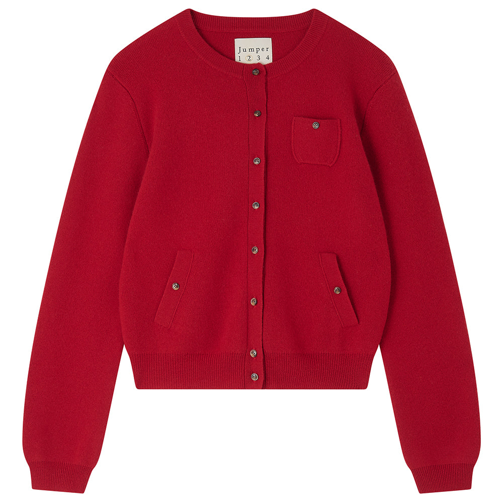 Jumper 1234 merino cardigan. Red merino wool crew neck cardigan with lots of pockets, all of which are useful! Available in 5 colours. It is a neat fit, still true to size, but size up if you want to wear it a little looser! This is the first time we've offered 100% merino, and even if we say so ourselves it's pretty amazing!