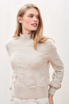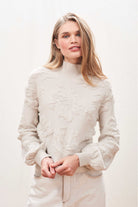 Jumper 1234 cashmere jumper. Cashmere turtle neck jumper in stone, with all over 3d floral jacquard pattern. A tricky one to describe but it's realy fabulous. It's true to size, with slight balloon sleeves and also comes in navy.