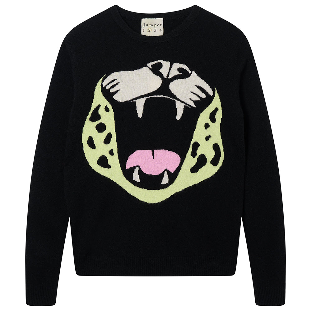 Jumper 1234 cashmere wool jumper. Black cashmere and wool classic fit crew neck with 'roar' intarsia. We particularly love this style and hope you do too!