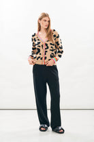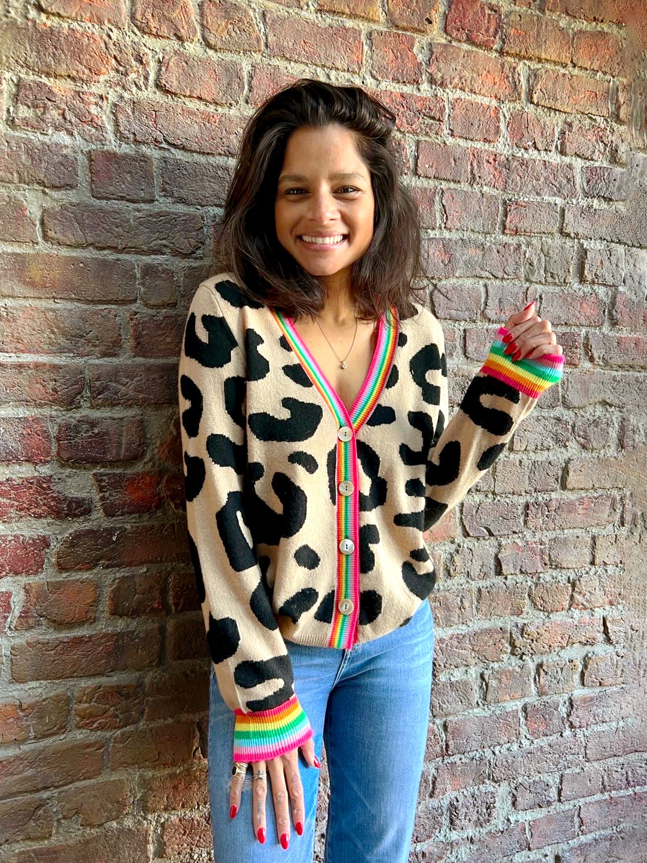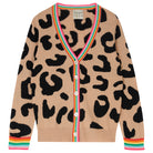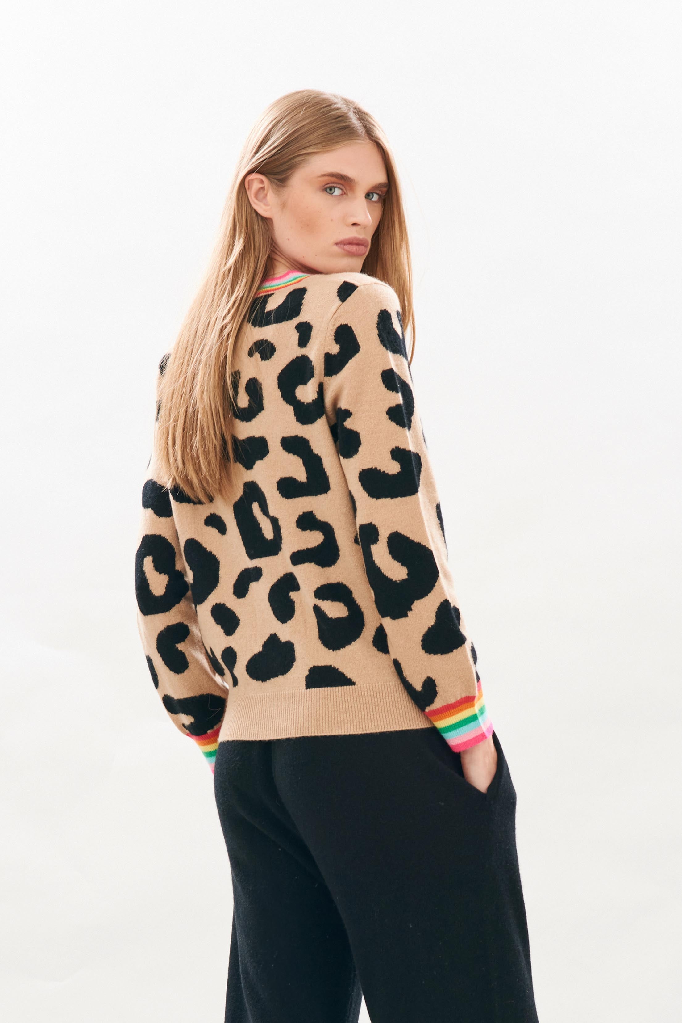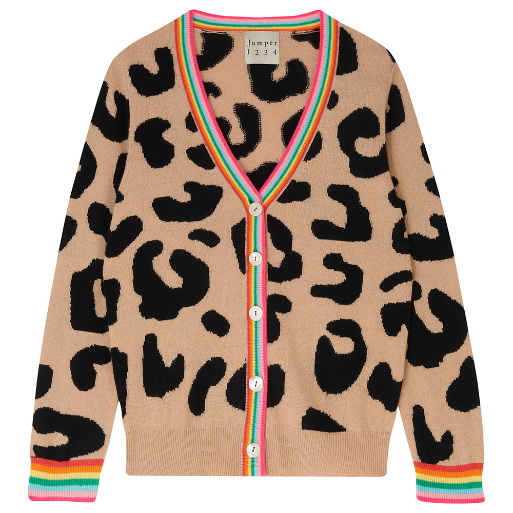 Jumper 1234 cashmere cardigan in leopard. Camel cashmere vee neck cardigan with black leopard intarsia and rainbow ribs. After a conversation with our wonderful friend Dilly Carter from Declutter Dollies we combined her favourite rainbow cardigan with her favourite print - LEOPARD. We're pretty delighted with the results! True to size and very limited addition, and an online exclusive.