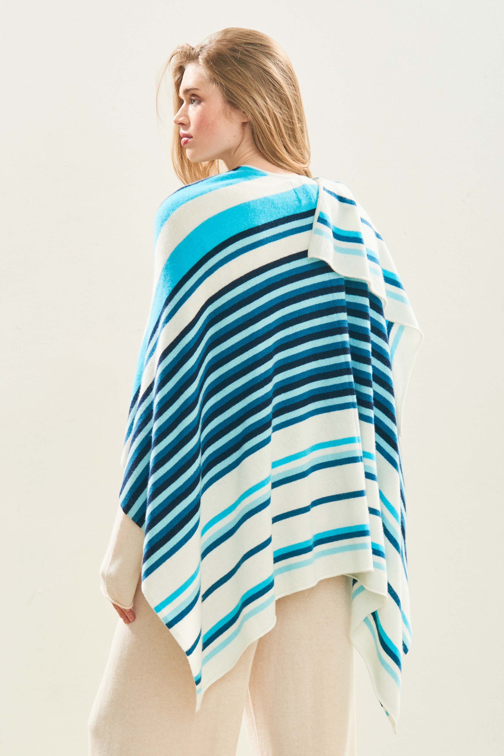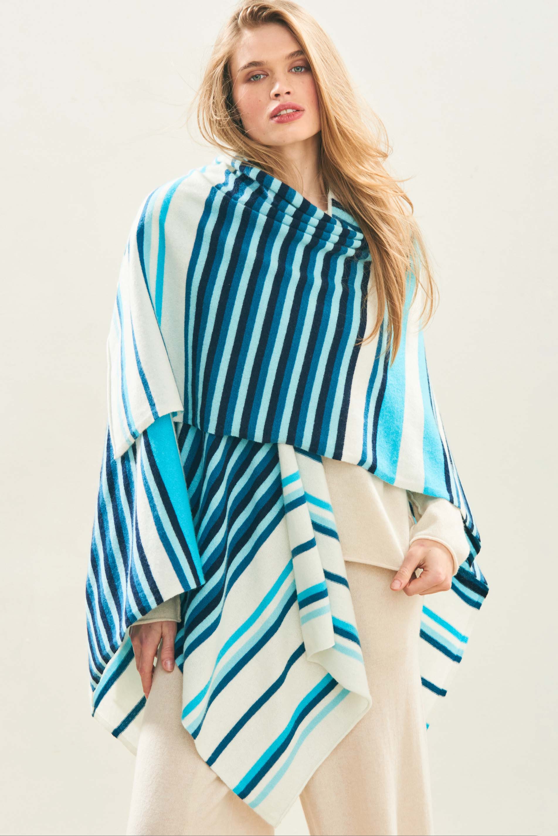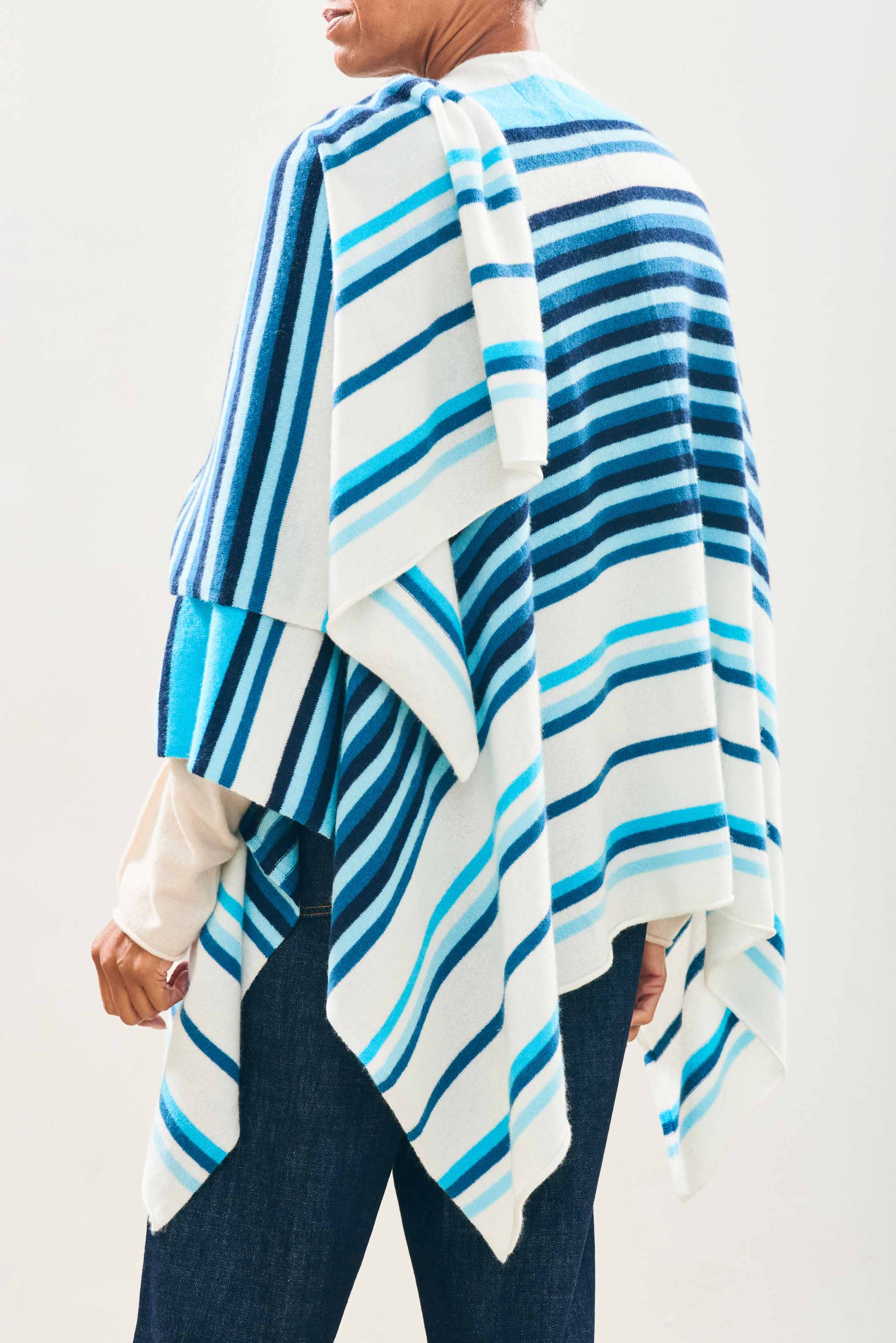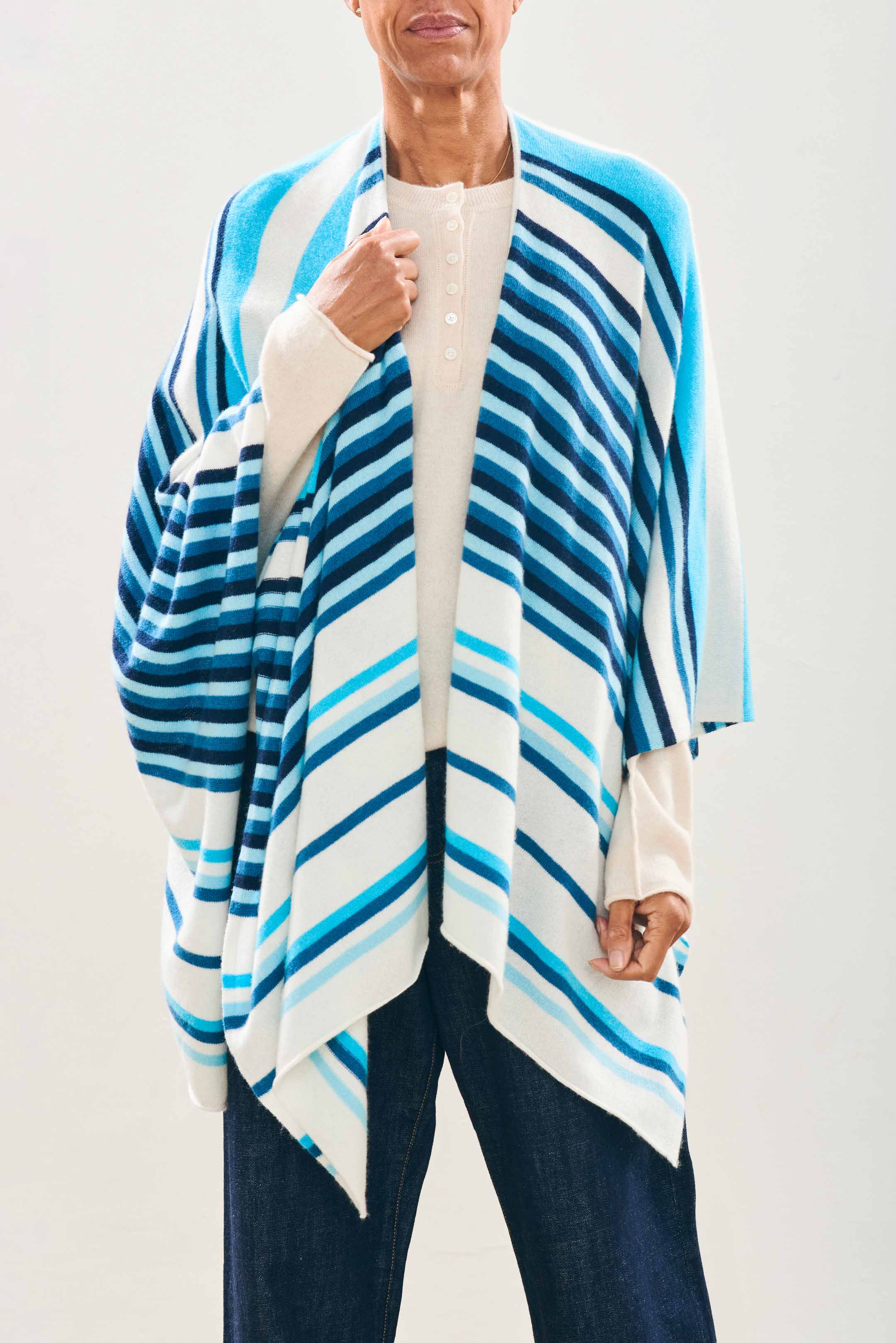 Jumper 1234 cashmere jumper. Cream cashmere wrap with multi stripes in lots of shades of blue. One size only.