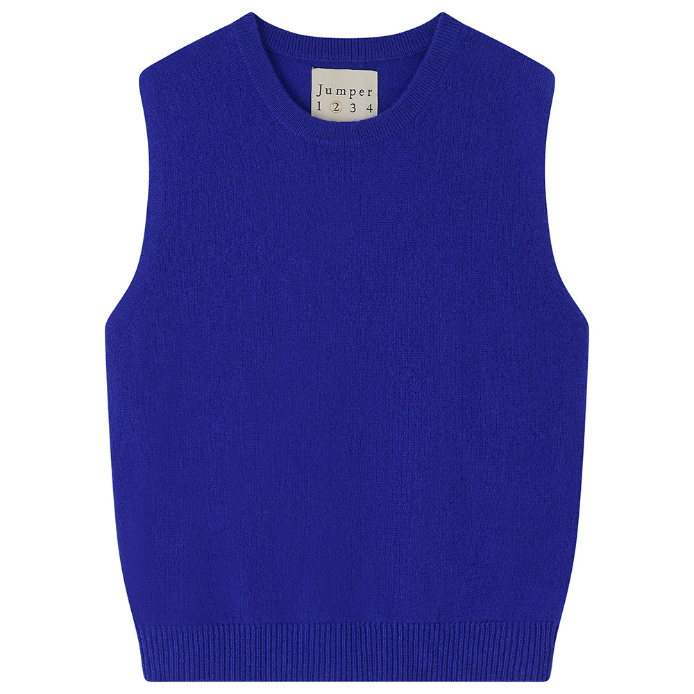 Jumper 1234 cashmere jumper. Bright Blue cashmere sleeveless crew neck tank with matching 'perfect' cardigan available too. There are 5 colours and it's part of our core collection, those jumpers and cardigans in plain and stripe that you always need, but can't always find!