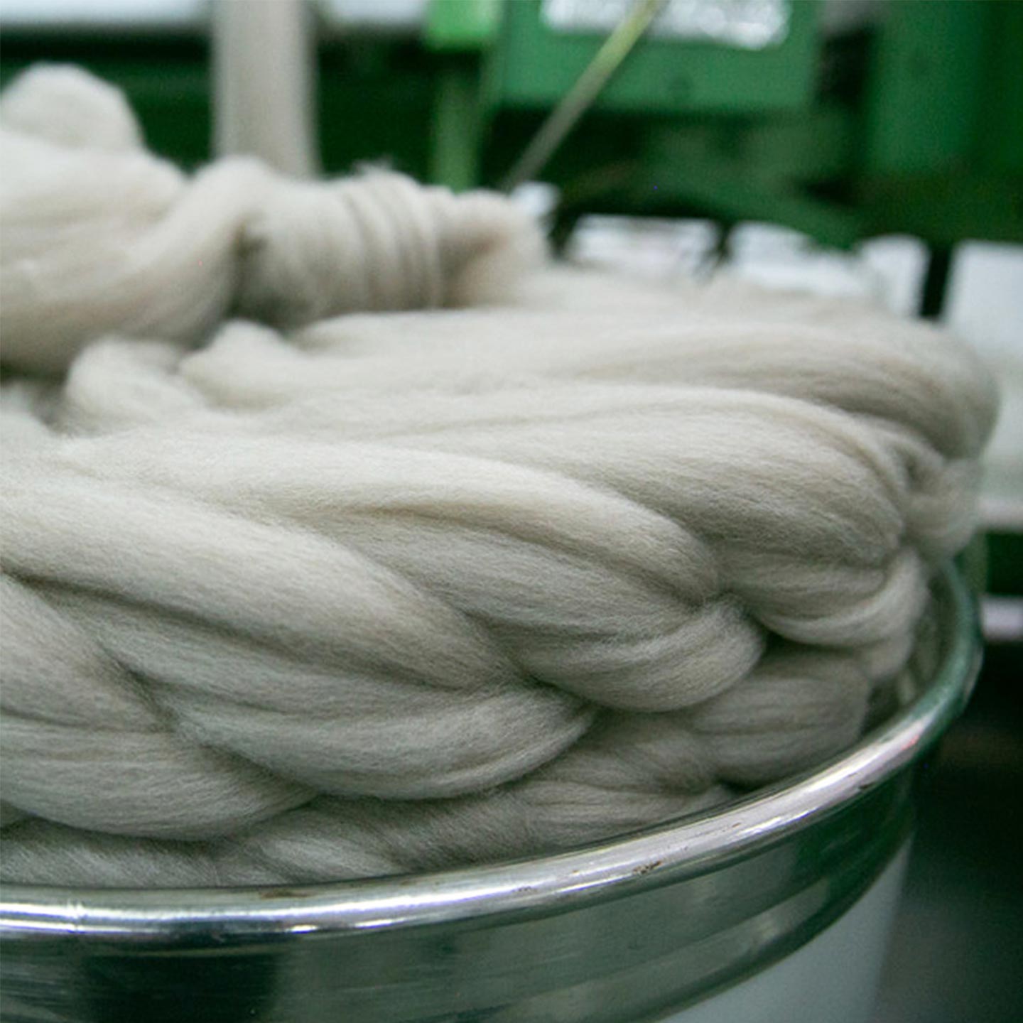 Carding & Spinning: The fibres are carded and spun to create yarns. Carding, a mechanical process, aligns fibres vertically to form a roving yarn. This roving yarn is then spun on a spinning mule to add twist, resulting in premium-quality yarns developed through years of testing.