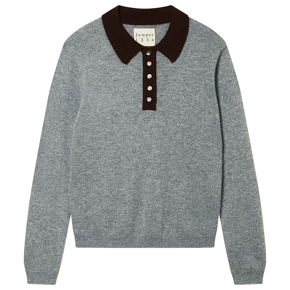 Jumper 1234 cashmere jumper. Mid grey cashmere polo shirt with a contrast dark brown collar. True to size and also available in mid grey and black.