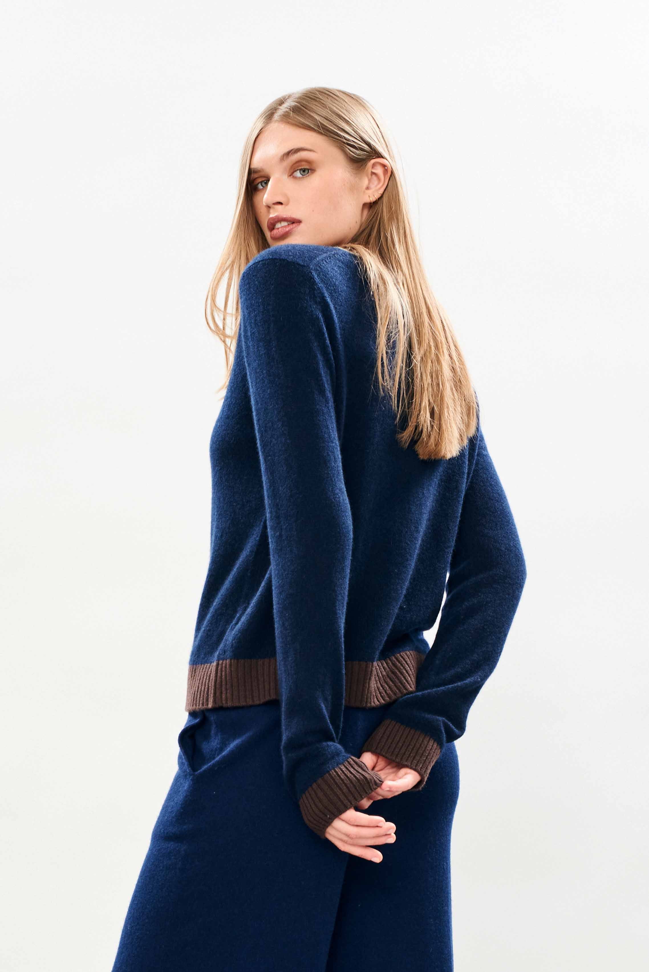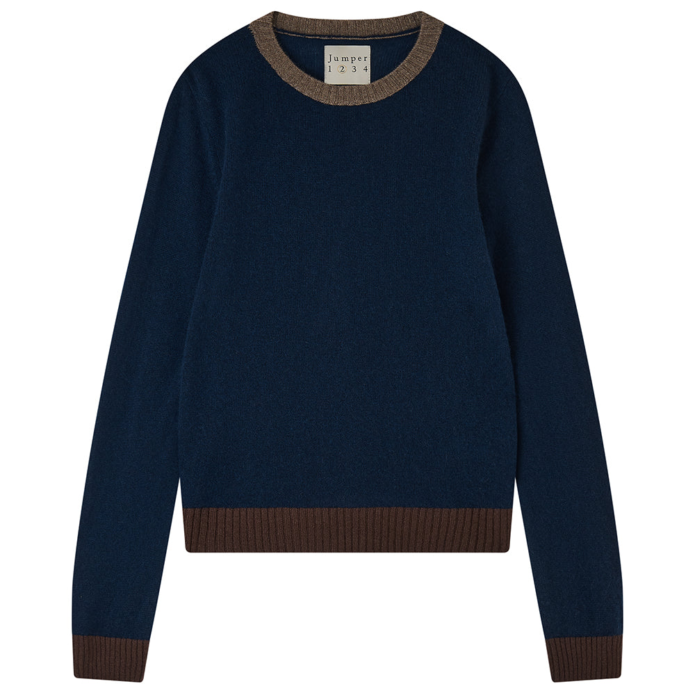 Jumper 1234 cashmere jumper. Our best selling cashmere crew in navy with contrast ribs in moose and dark brown. Available in 3 colourways and part of our core collection, those jumpers and cardigans in plain and stripe that you always need, but can't always find! Also you have been warned, this is an online exclusive so when they're gone they're gone!