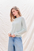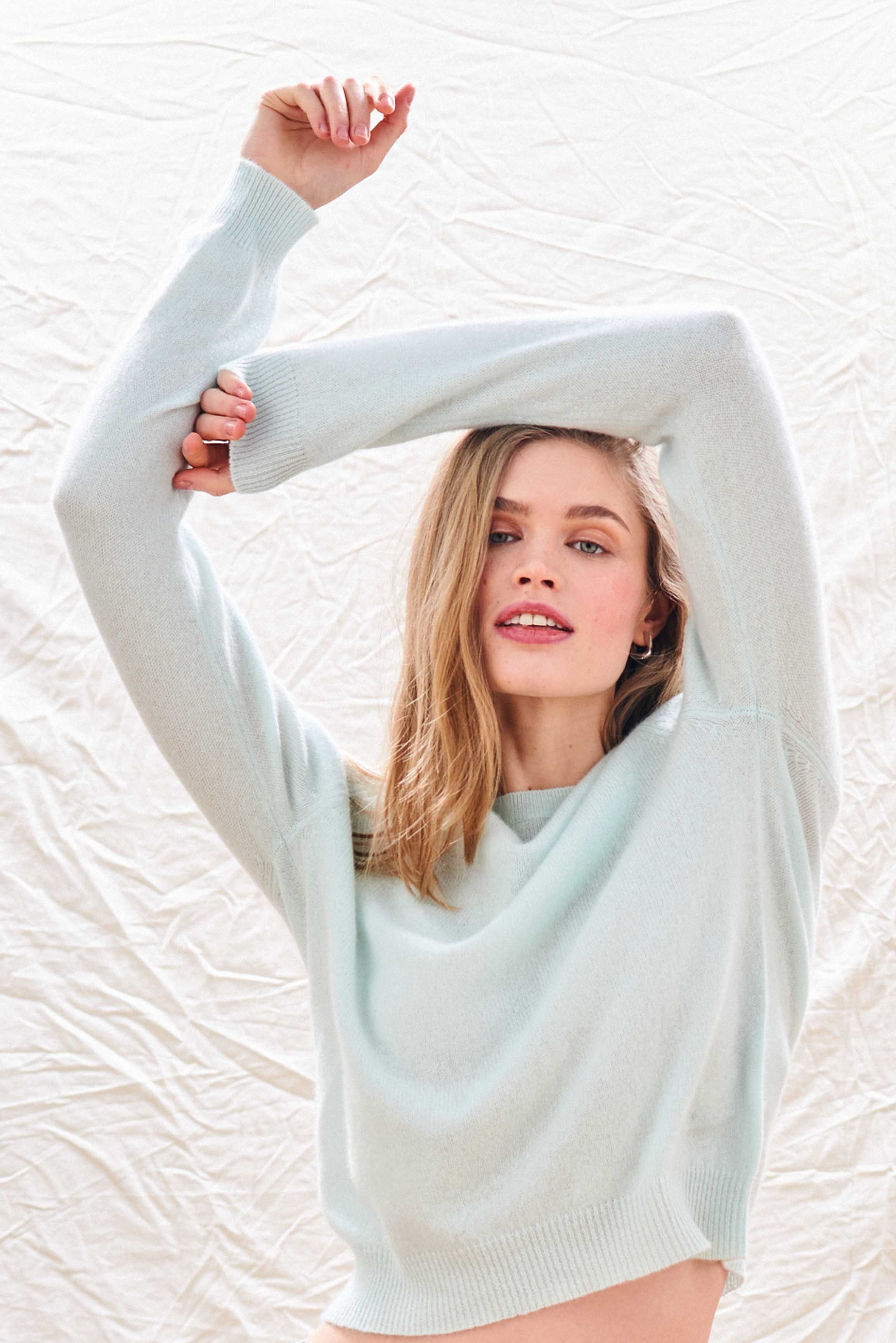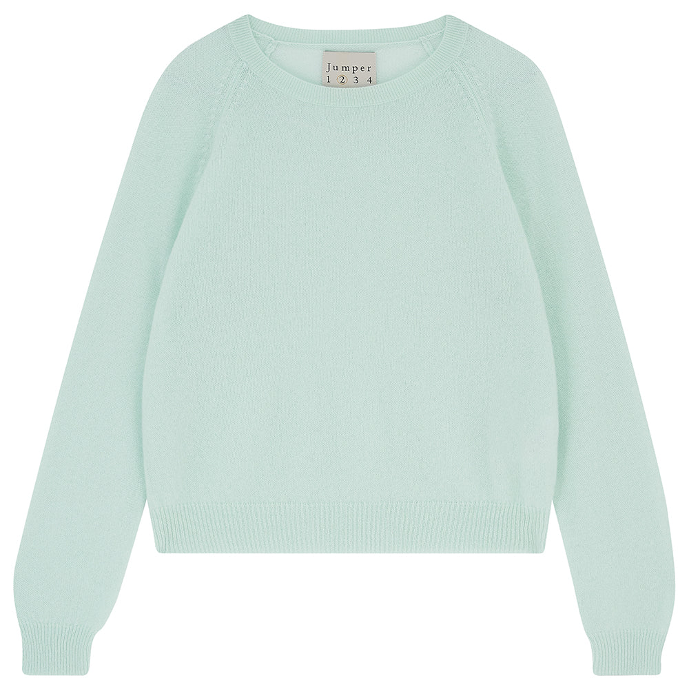 Jumper 1234 cashmere jumper. Our lightweight cashmere crew neck in pale green with raglan sleeves and slightly shorter in the body than our 'classic fit'. Available in 6 colours and part of our core collection, those jumpers and cardigans in plain and stripe that you always need, but can't always find!