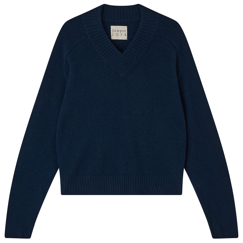 Jumper 1234 cashmere jumper. Our heavier weight cashmere in navy with a relatively high vee neck and slightly oversize boxy fit. Available in 5 colours and part of our core collection, those jumpers and cardigans in plain and stripe that you always need, but can't always find!