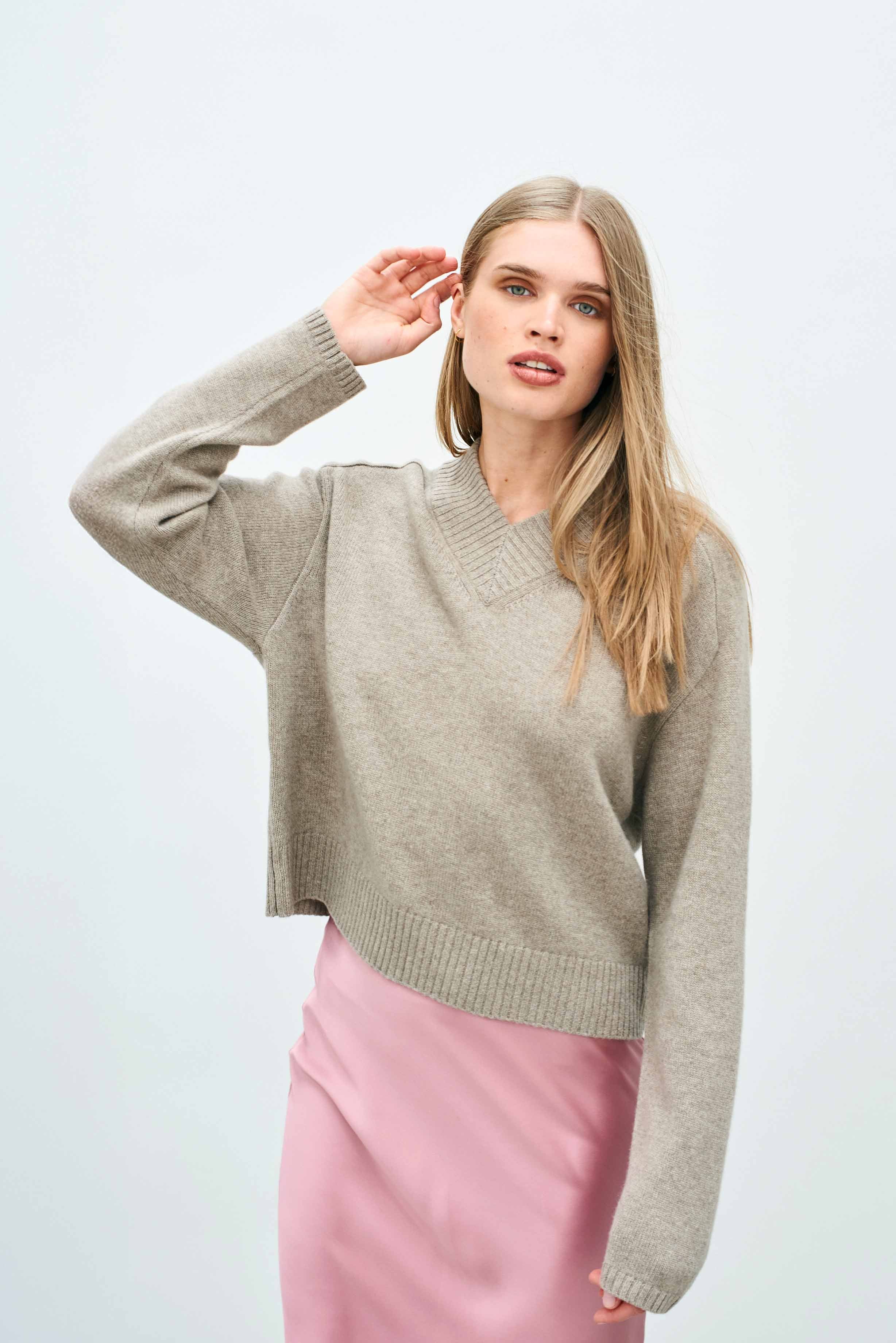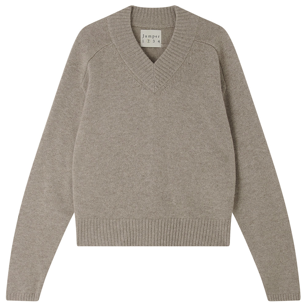 Jumper 1234 cashmere jumper. Our heavier weight cashmere in organic light brown with a relatively high vee neck and slightly oversize boxy fit. Available in 5 colours and part of our core collection, those jumpers and cardigans in plain and stripe that you always need, but can't always find!