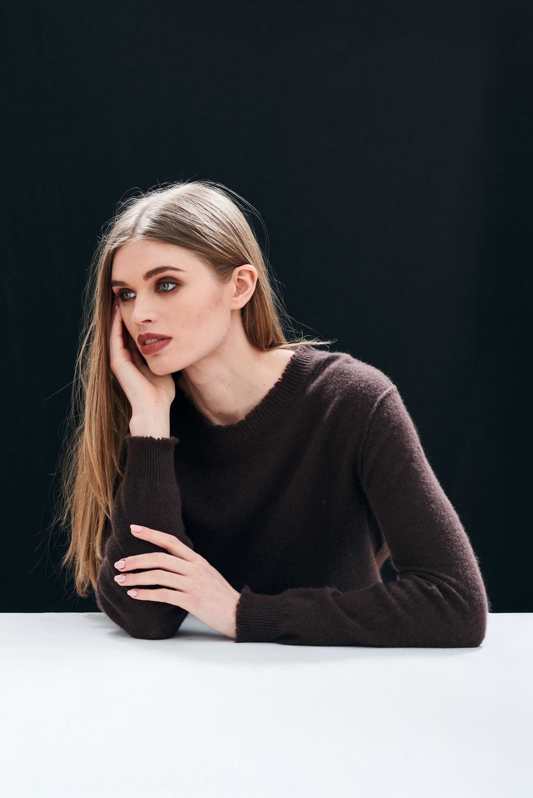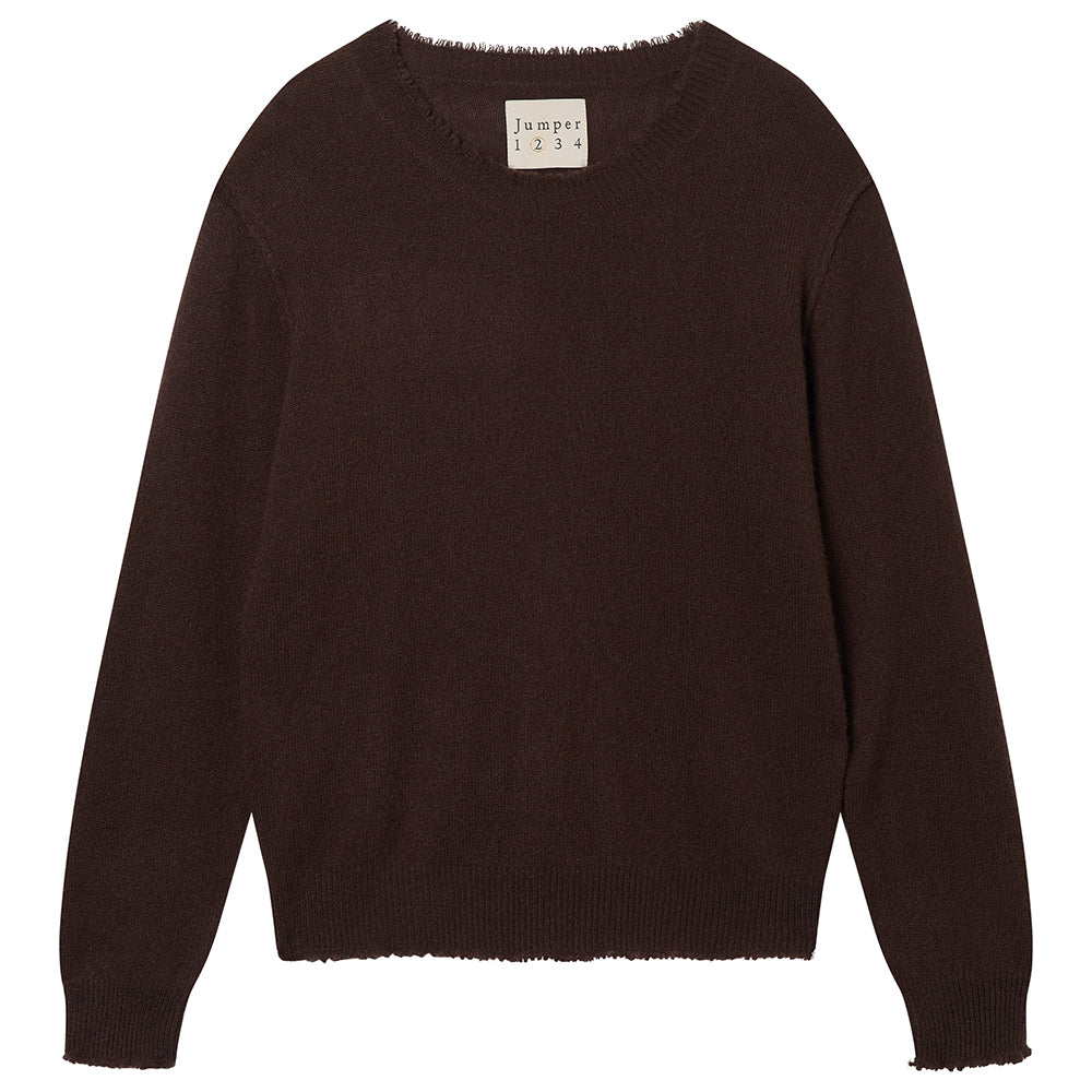 Jumper 1234 cashmere jumper. Dark brown cashmere crew neck with 'distressed' ribs. We are obsessed with this style, to the point that we needed to offer it in 13 colours. It's a generous fit and even if we say so ourselves a great update to a classic fit crew neck! Part of our core collection, those jumpers and cardigans in plain and stripe that you also need, but can't always find!