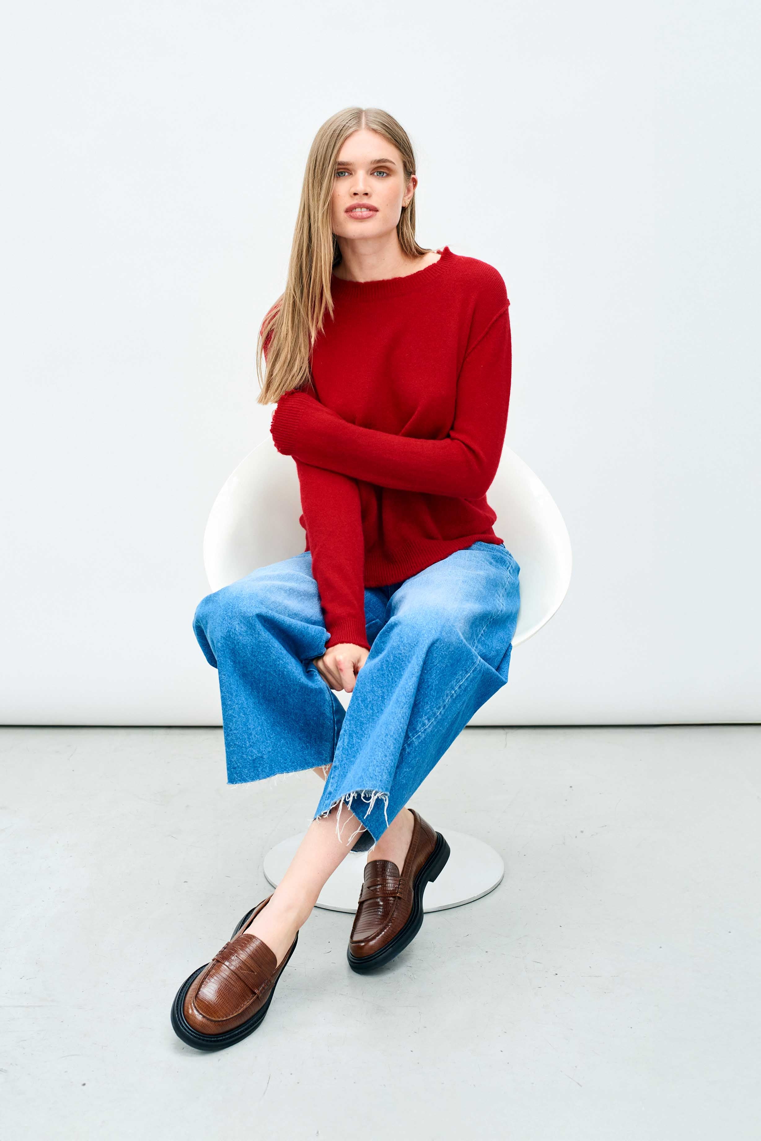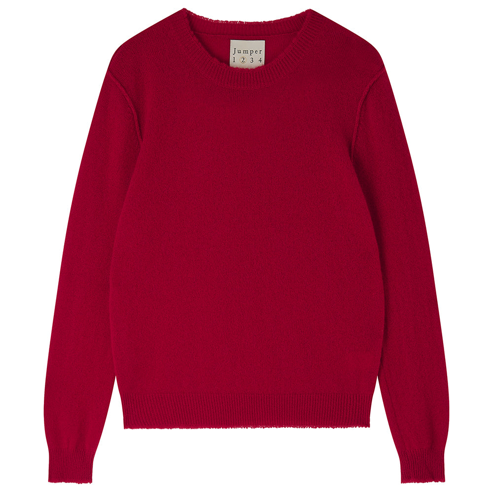 Jumper 1234 cashmere jumper. Dark red cashmere crew neck with 'distressed' ribs. We are obsessed with this style, to the point that we needed to offer it in 13 colours. It's a generous fit and even if we say so ourselves a great update to a classic fit crew neck! Part of our core collection, those jumpers and cardigans in plain and stripe that you also need, but can't always find!