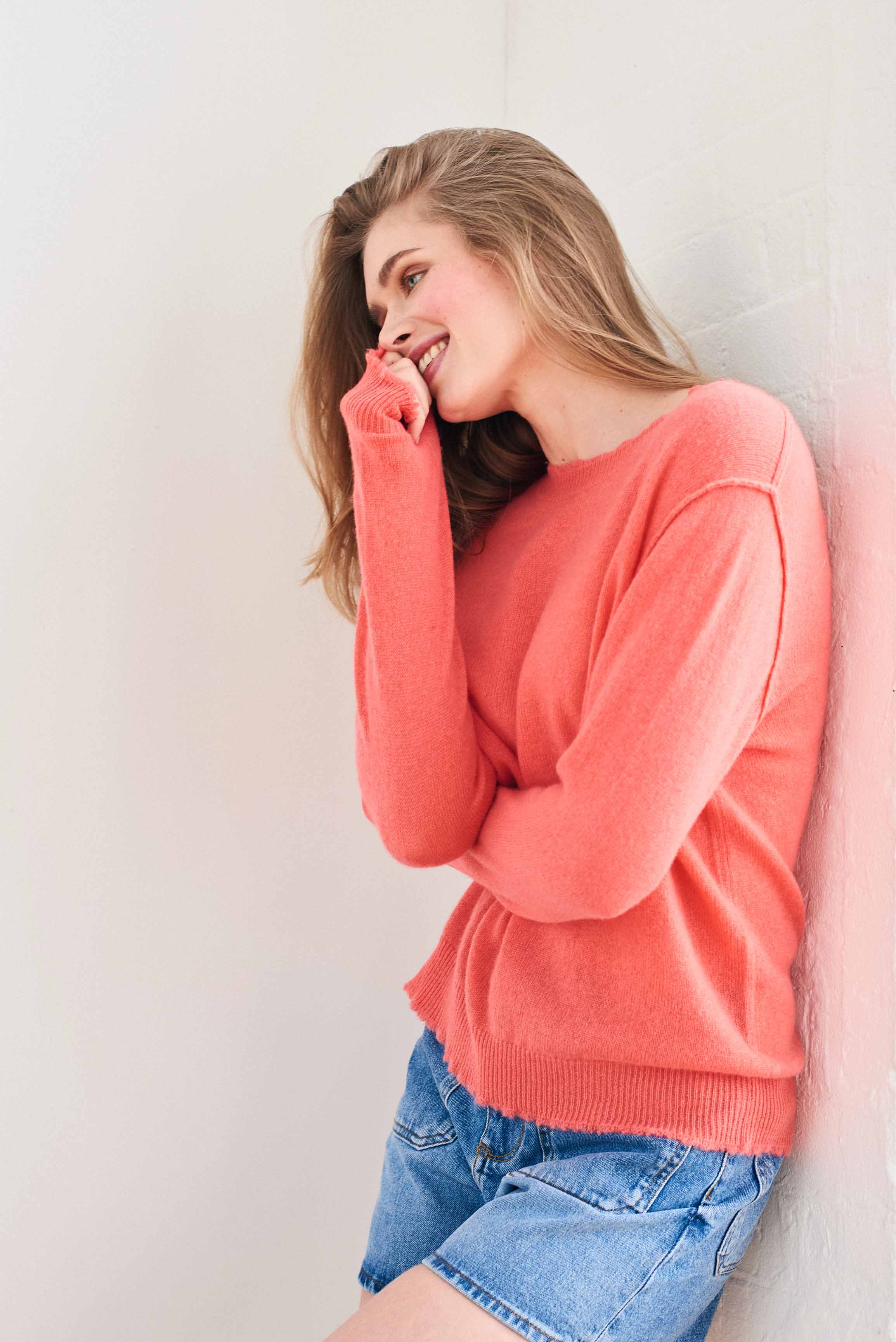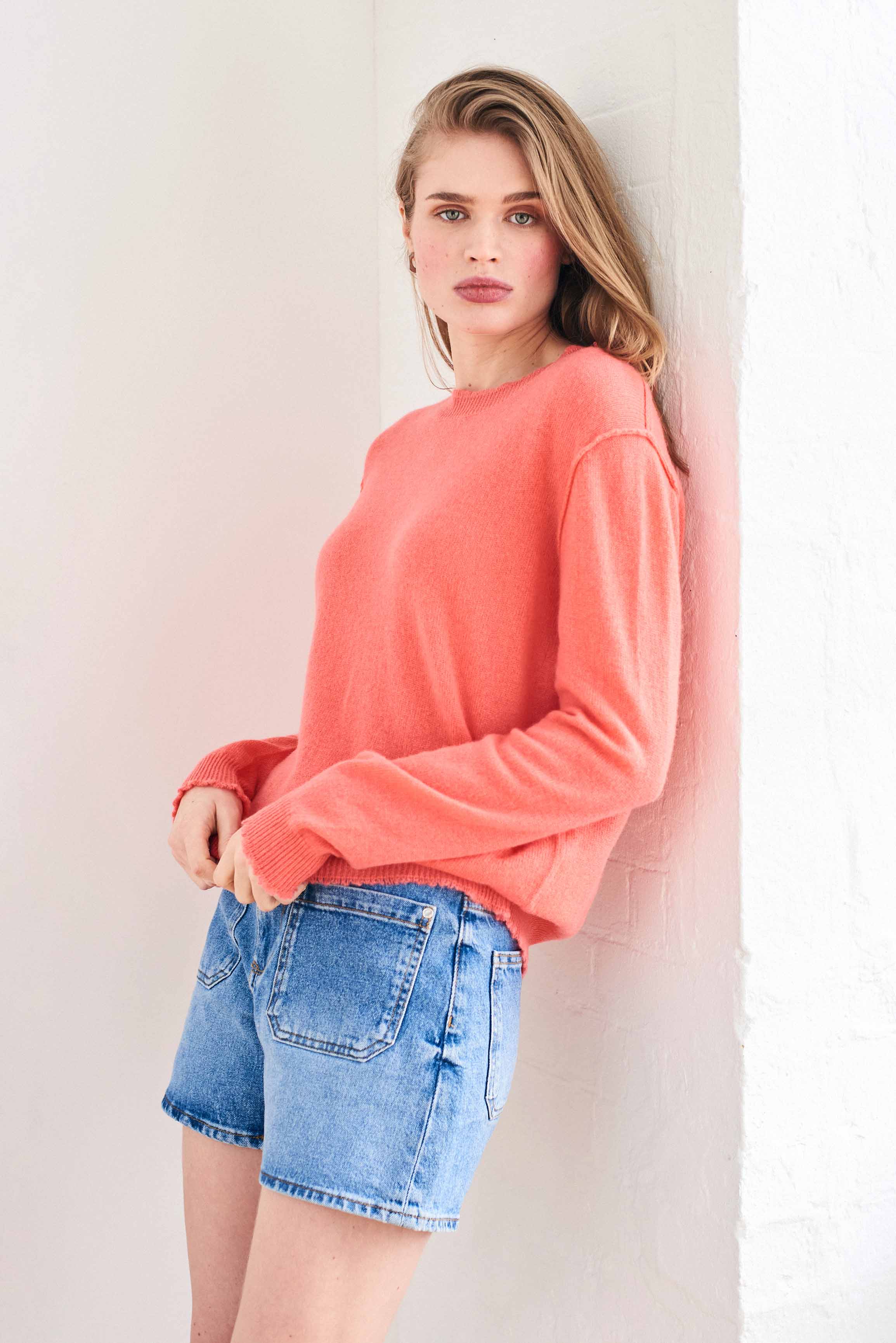 Jumper 1234 cashmere jumper. Coral cashmere crew neck with 'distressed' ribs. We are obsessed with this style, to the point that we needed to offer it in 11 colours. It's a generous fit and even if we say so ourselves a great update to a classic fit crew neck! Part of our core collection, those jumpers and cardigans in plain and stripe that you also need, but can't always find!