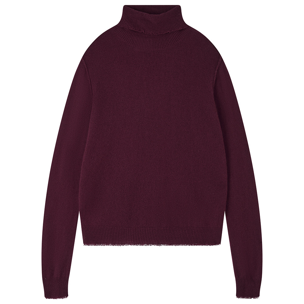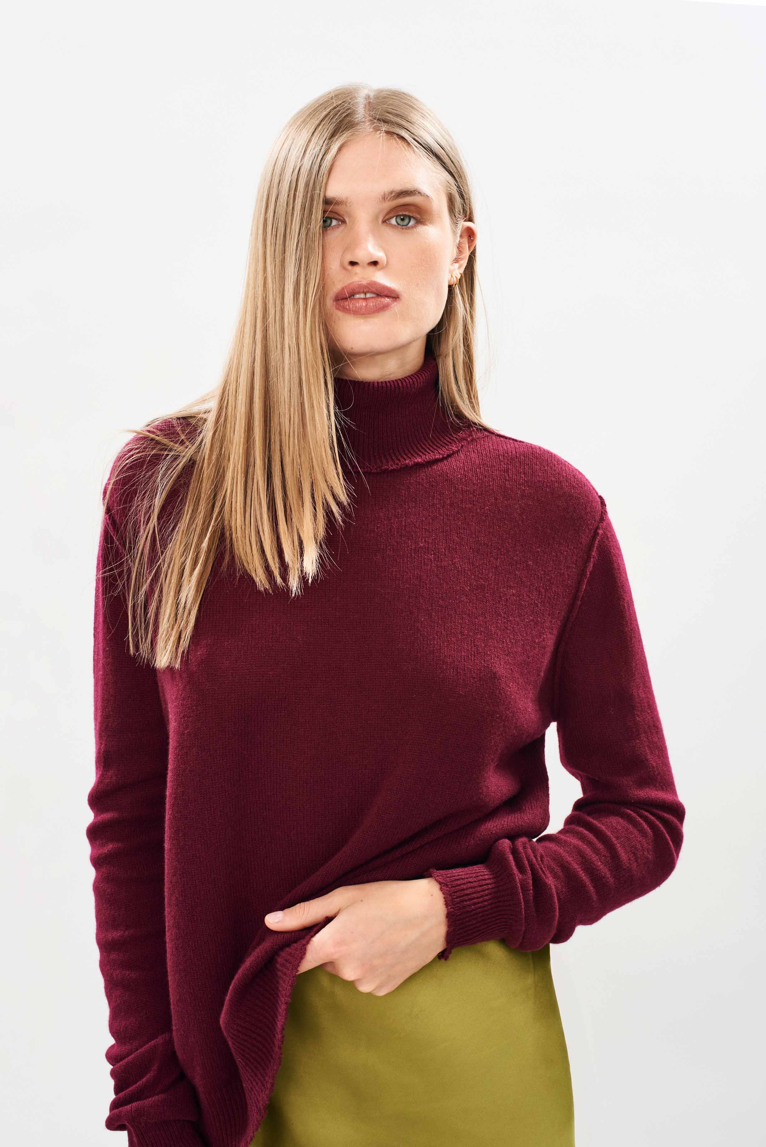 Jumper 1234 cashmere jumper. Burgundy cashmere roll collar with 'distressed' ribs. We are obsessed with this new style, based on our best selling 'distressed' crew neck but updated for autumn winter with a roll collar, we are so obsessed in fact that we needed to offer it in 12 colours. It's true to size and part of our core collection, those jumpers and cardigans in plain and stripe that you always need, but can't always find!