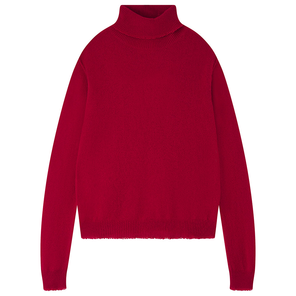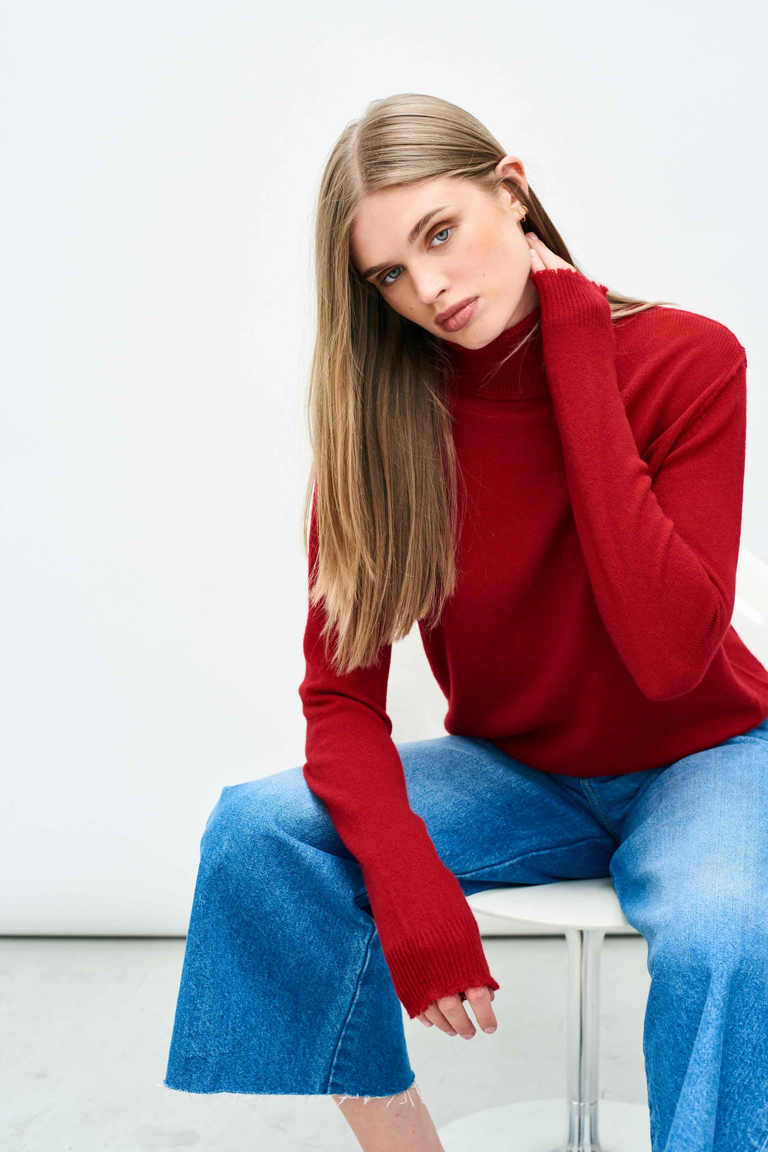Jumper 1234 cashmere jumper. Dark red cashmere roll collar with 'distressed' ribs. We are obsessed with this new style, based on our best selling 'distressed' crew neck but updated for autumn winter with a roll collar, we are so obsessed in fact that we needed to offer it in 12 colours. It's true to size and part of our core collection, those jumpers and cardigans in plain and stripe that you always need, but can't always find!