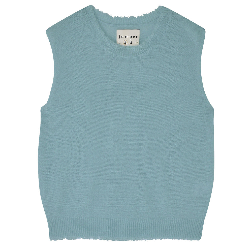 Jumper 1234 cashmere jumper. Blue cashmere crew neck tank with 'distressed' ribs. Our best seller, back in 8 new colours for autumn winter, and this time there are matching 'distressed' cardigans too. Heaven in a twinset? Oh and it's true to size! Part of our core collection, those jumpers and cardigans in plain and stripe that you always need, but can't always find!