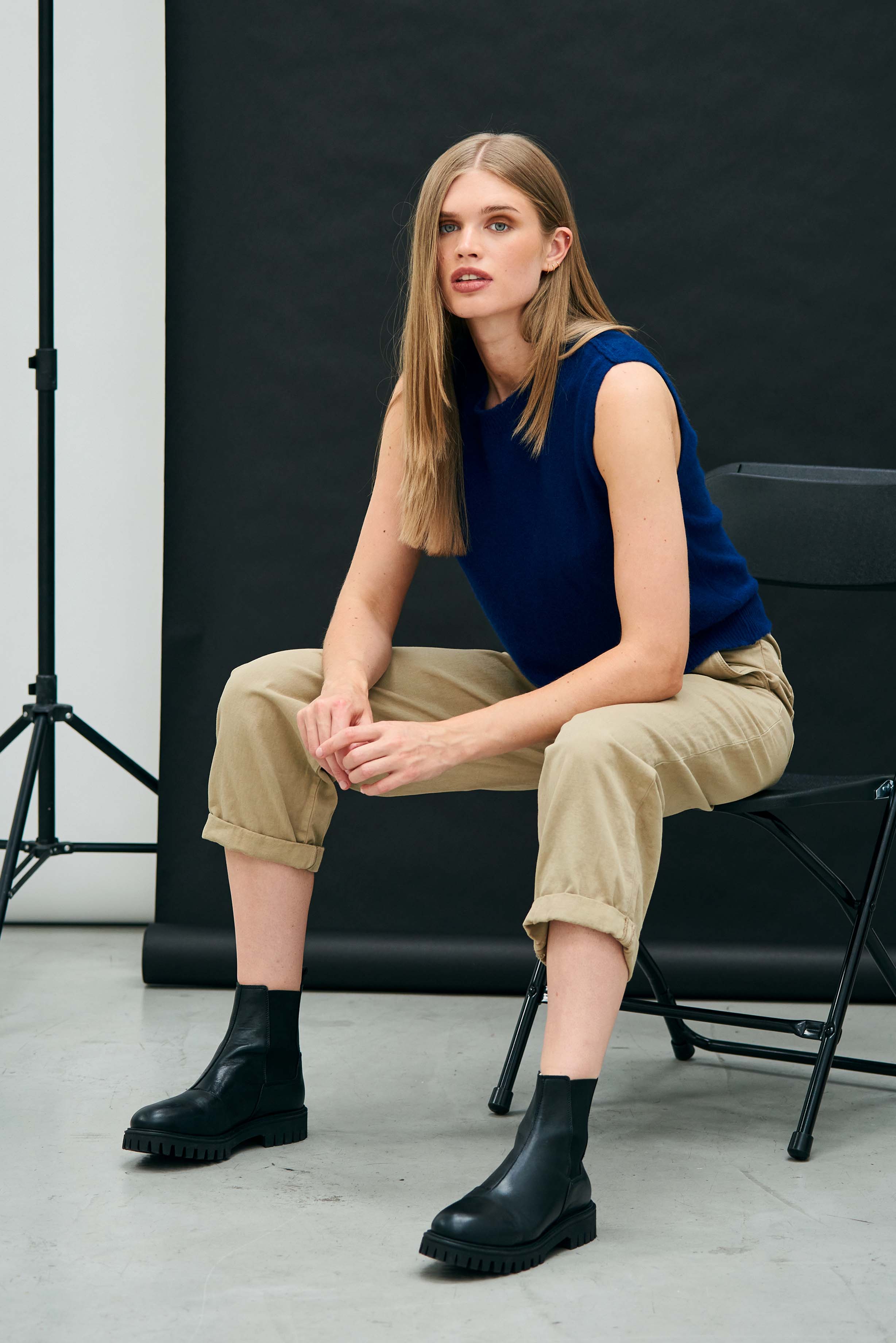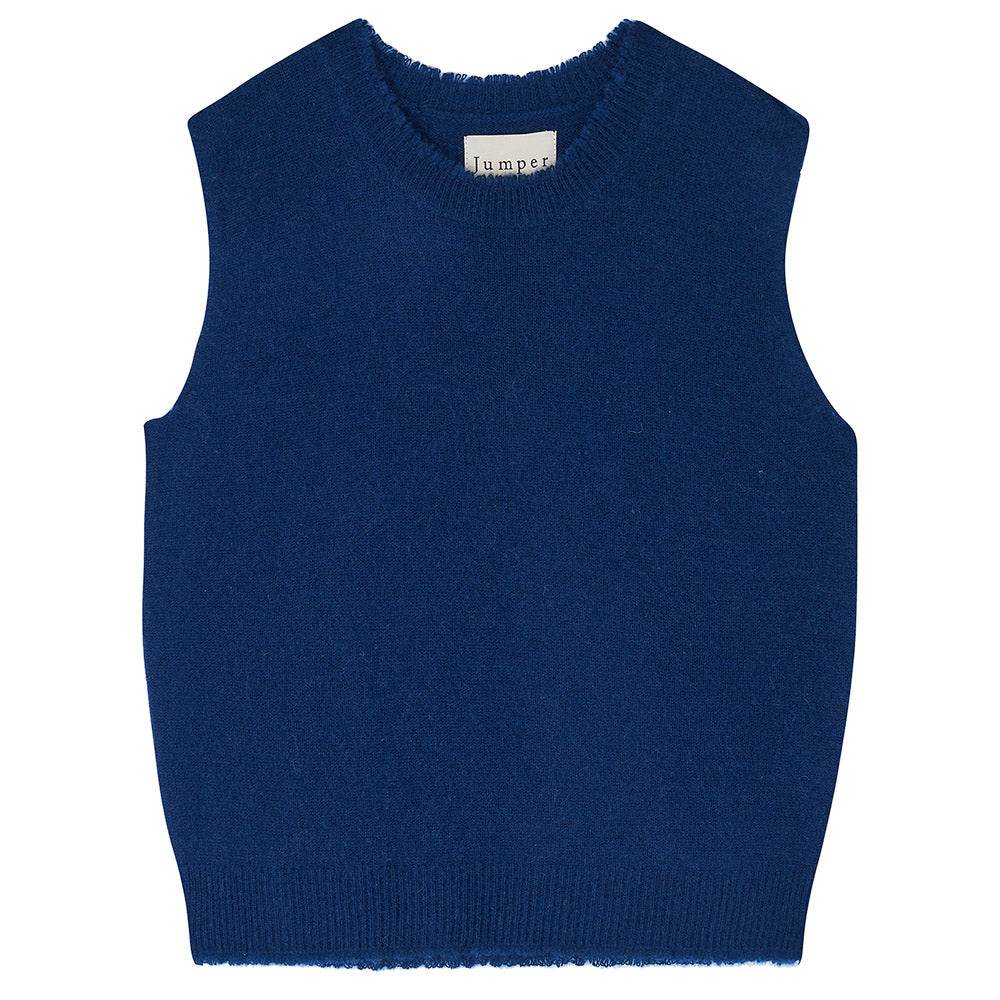 Jumper 1234 cashmere jumper. Denim blue cashmere crew neck tank with 'distressed' ribs. Our best seller, back in 8 new colours for autumn winter, and this time there are matching 'distressed' cardigans too. Heaven in a twinset? Oh and it's true to size! Part of our core collection, those jumpers and cardigans in plain and stripe that you always need, but can't always find!