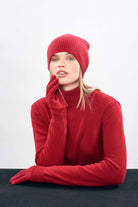 Jumper 1234 cashmere gloves. Dark red cashmere gloves, available in 5 colours, with a choice of matching hats. We also have plain fingerless gloves too.