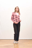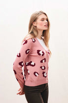 Jumper 1234 cashmere cardigan. Easy fit pink cashmere vee neck cardigan with burgundy and cream leopard intarsia. We are so excited to be collaborating with the wonderful Gayle Rinkoff again on two very special limited-edition pieces. Gayle loves leopard almost as much as she loves bows, and we couldn't work together without offering some leopard intarsia! We're beyond delighted with the results and politely suggest you don't hang around, as we already know we didn't order enough!