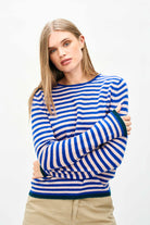 Jumper 1234 cashmere jumper. Our best selling lightweight little stripe crew, reimagined for autumn winter in 4 brand new colour ways, all online exclusives. This version has bright blue and pale pink stripes with contrast bottle green tipping and it's true to size. Part of our core collection, those jumpers and cardigans in plain and stripe that you always need, but can't always find!