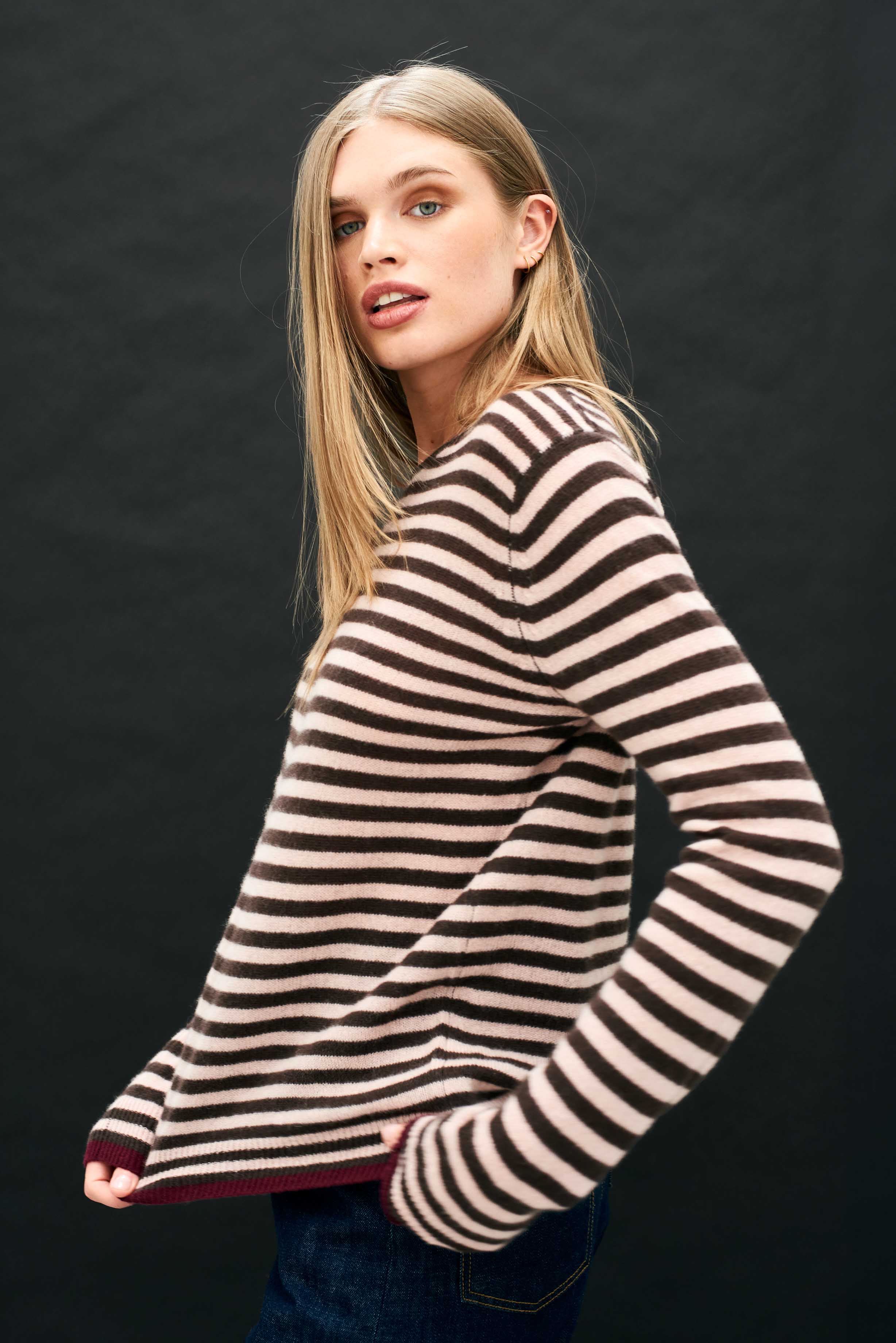 Jumper 1234 cashmere jumper. Our best selling lightweight little stripe crew, reimagined for autumn winter in 4 brand new colour ways, all online exclusives. This version has dark brown and pink stripes with contrast burgundy tipping and it's true to size. Part of our core collection, those jumpers and cardigans in plain and stripe that you always need, but can't always find!