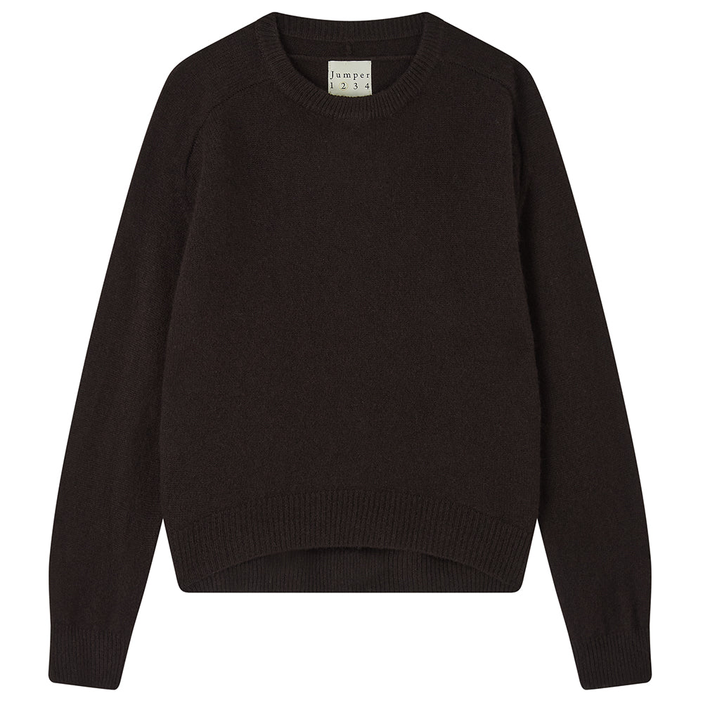 Jumper 1234 cashmere jumper. Our heavier weight cashmere crew neck in dark brown, with saddle shoulders and slightly longer at the back. Oversize fit and available in a mere 8 colours! Part of our core collection, those jumpers and cardigans in plain and stripe that you always need, but can't always find!