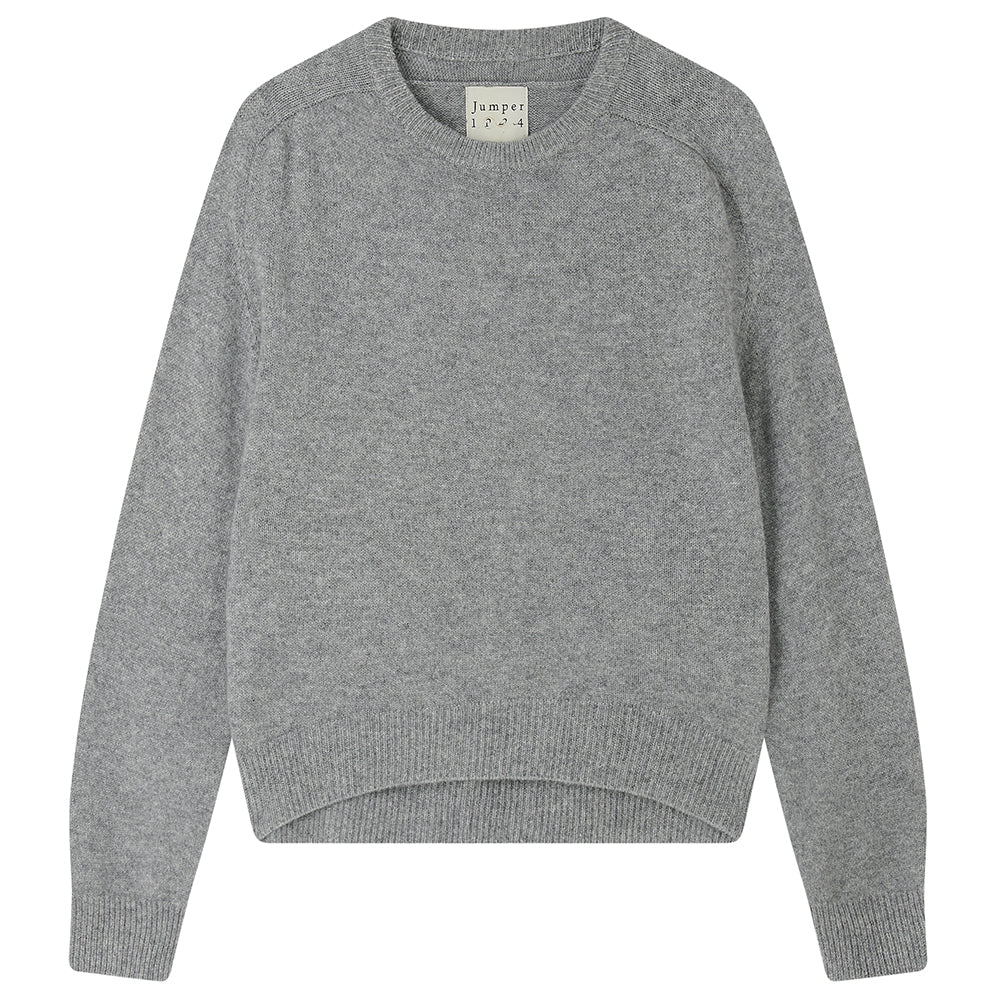 Jumper 1234 cashmere jumper. Our heavier weight cashmere crew neck in mid grey, with saddle shoulders and slightly longer at the back. Oversize fit and available in a mere 8 colours! Part of our core collection, those jumpers and cardigans in plain and stripe that you always need, but can't always find!