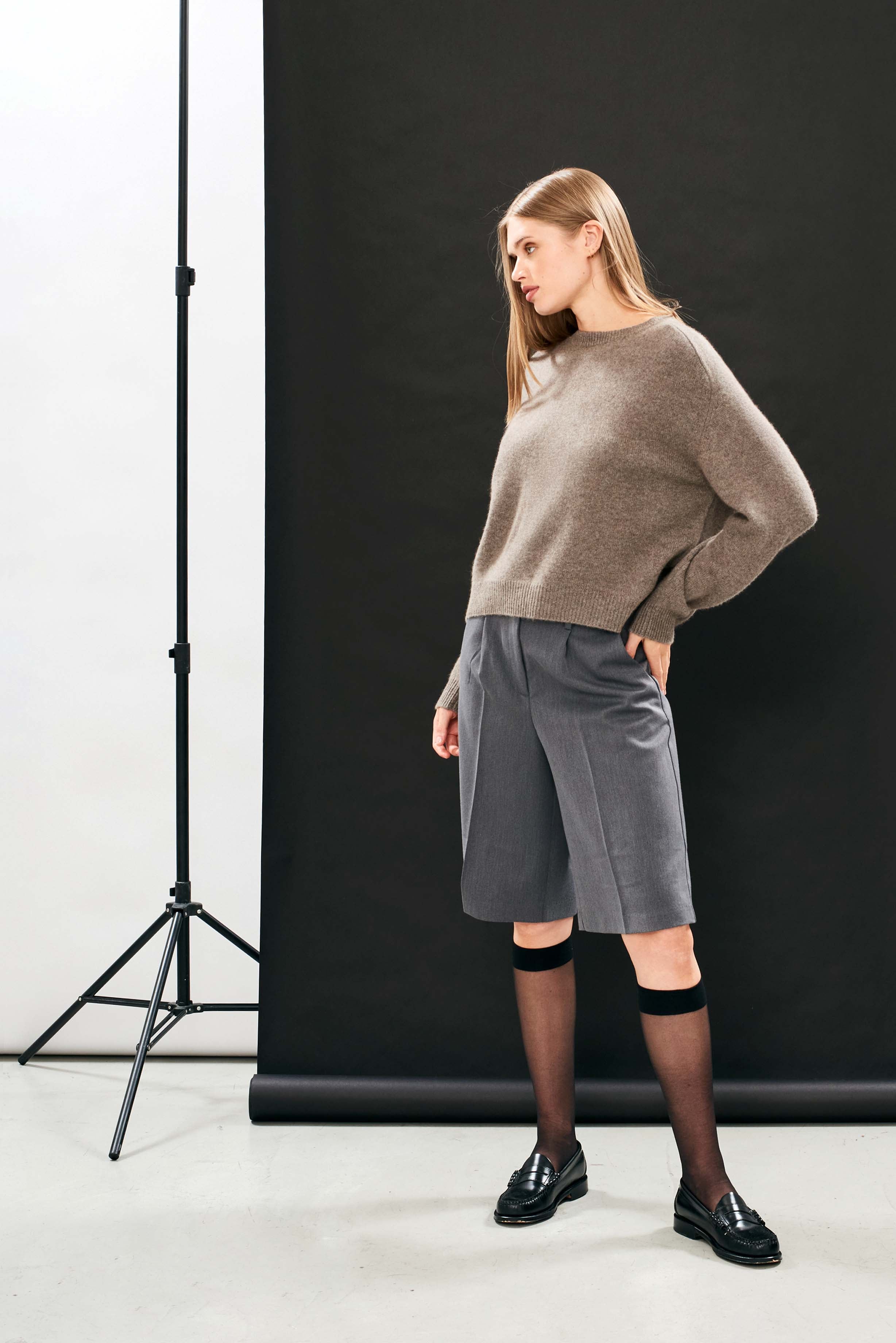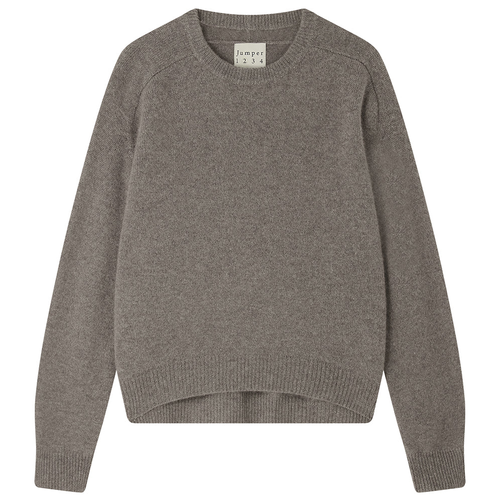 Jumper 1234 cashmere jumper. Our heavier weight cashmere crew neck in moose, with saddle shoulders and slightly longer at the back. Oversize fit and available in a mere 8 colours! Part of our core collection, those jumpers and cardigans in plain and stripe that you always need, but can't always find!