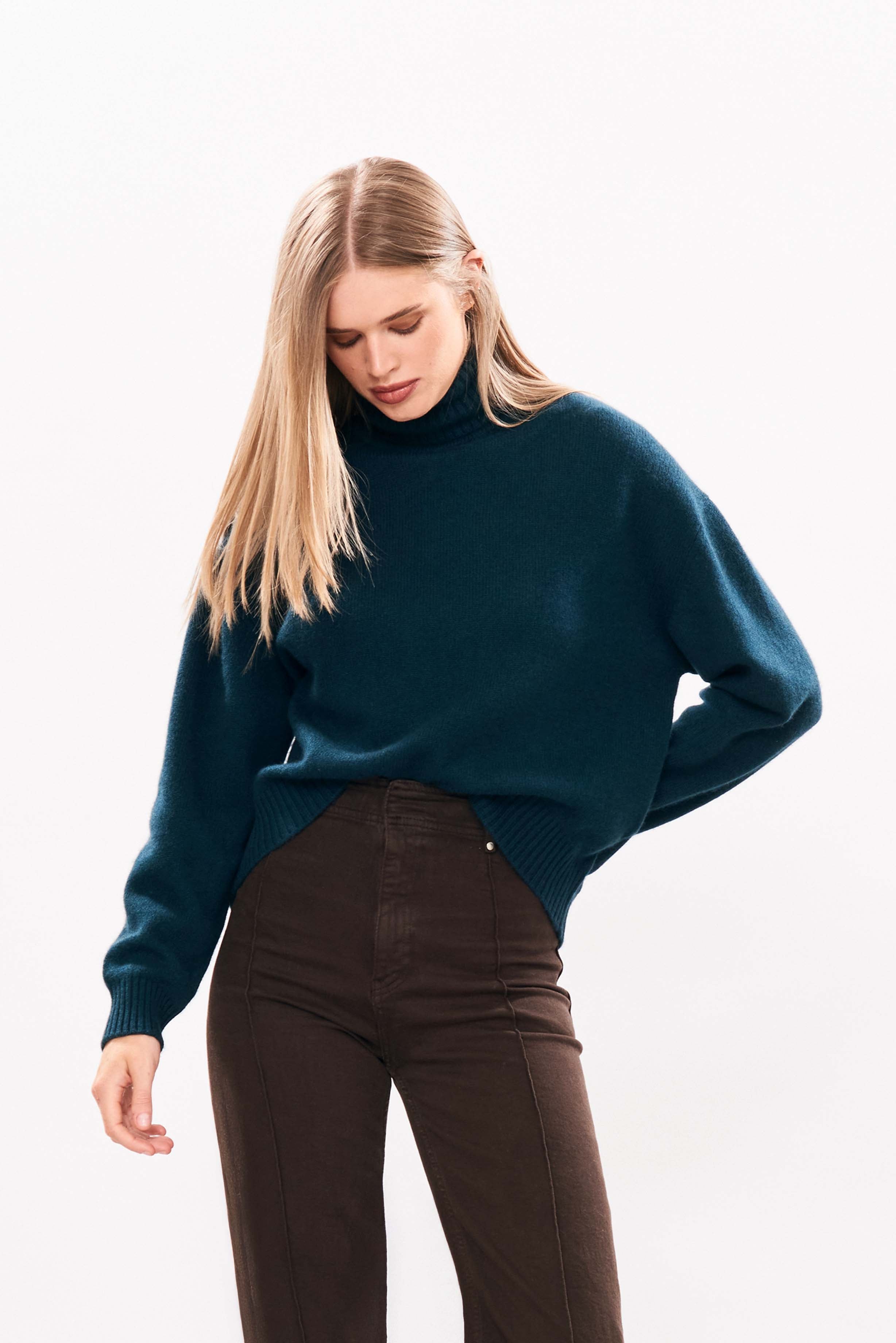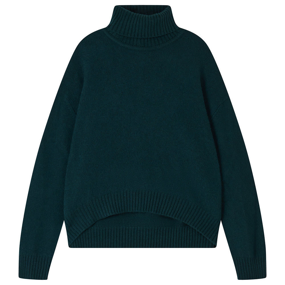 Jumper 1234 cashmere jumper. Bottle green oversized, heavier weight, cashmere roll neck. Slightly longer at the back, available in 8 colours! One of our favourite jumpers, we all live in these all winter long. Part of our core collection, those jumpers and cardigans in plain and stripe that you also need, but can't always find!