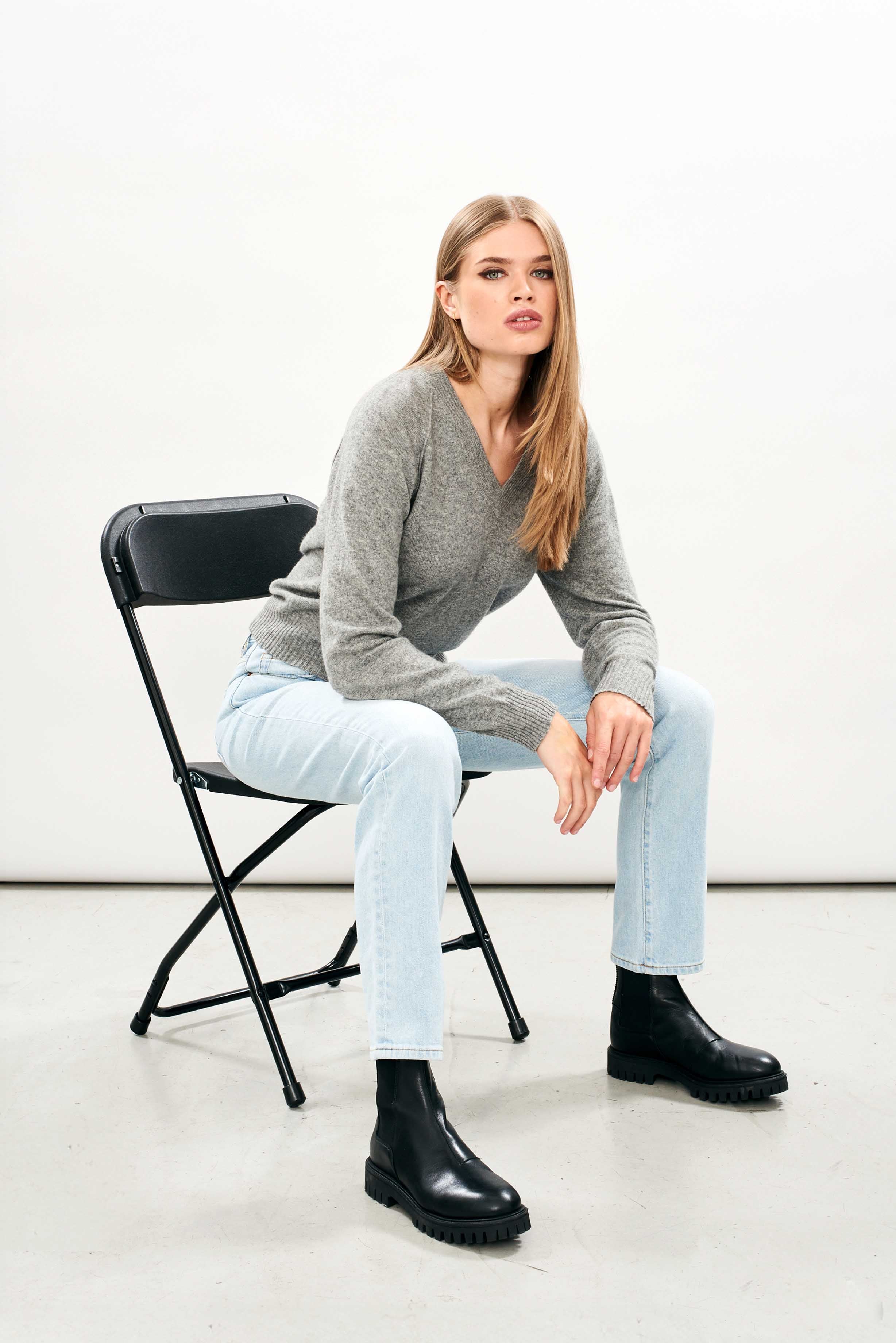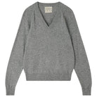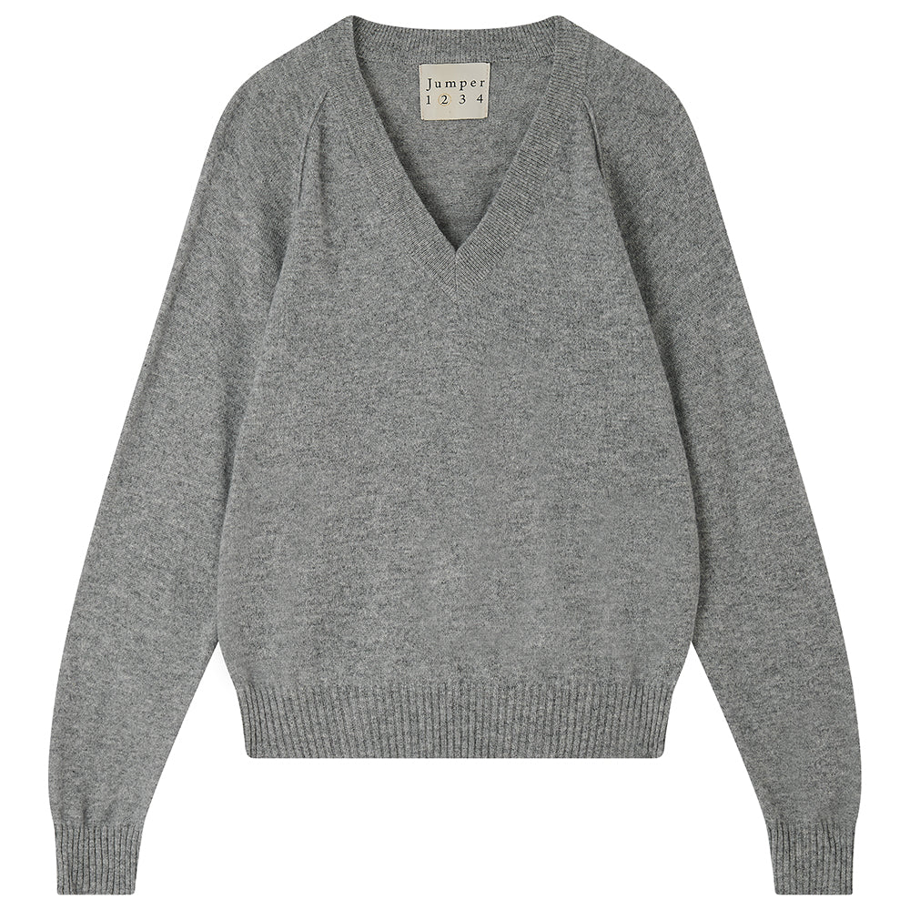 Jumper 1234 cashmere jumper. Mid grey cashmere raglan sleeve vee neck with exposed seams. Our new favourite jumper available in 5 very useful colours! Slightly oversize fit and perhaps one of the best vee necks we've ever made! Part of our core collection, those jumpers and cardigans in plain and stripe that you always need, but can't always find!