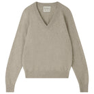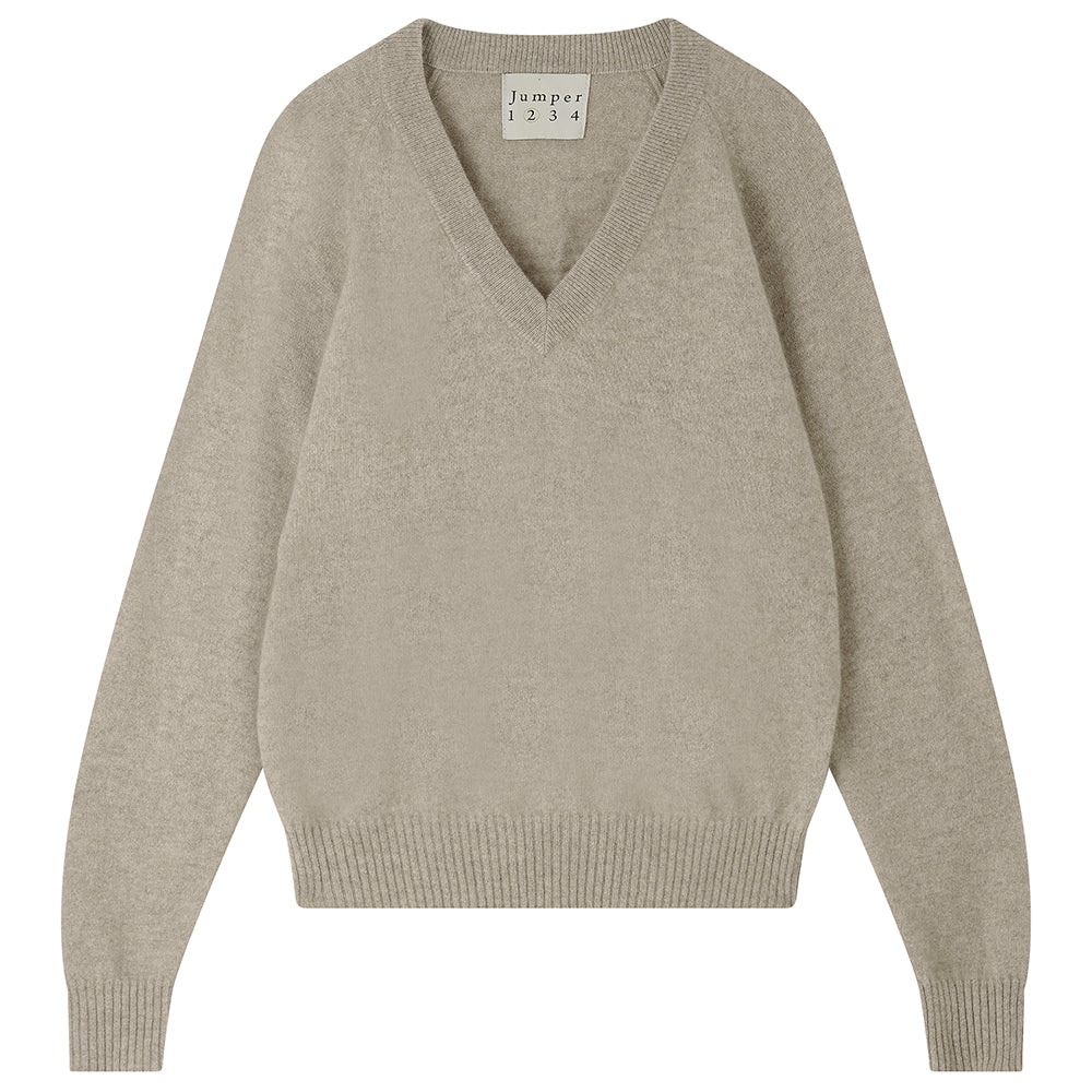 Jumper 1234 cashmere jumper. Organic light brown cashmere raglan sleeve vee neck with exposed seams. Our new favourite jumper available in 5 very useful colours! Slightly oversize fit and perhaps one of the best vee necks we've ever made! Part of our core collection, those jumpers and cardigans in plain and stripe that you always need, but can't always find!