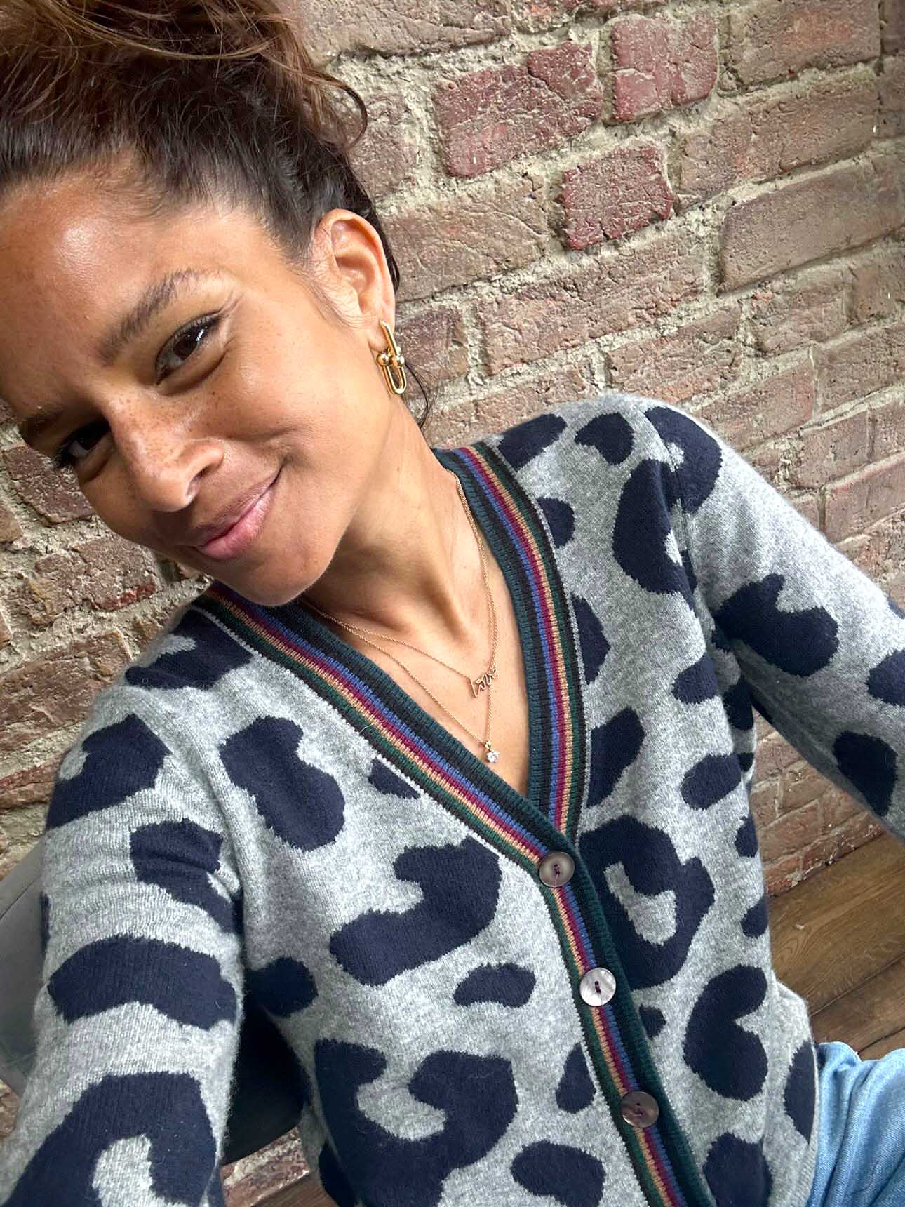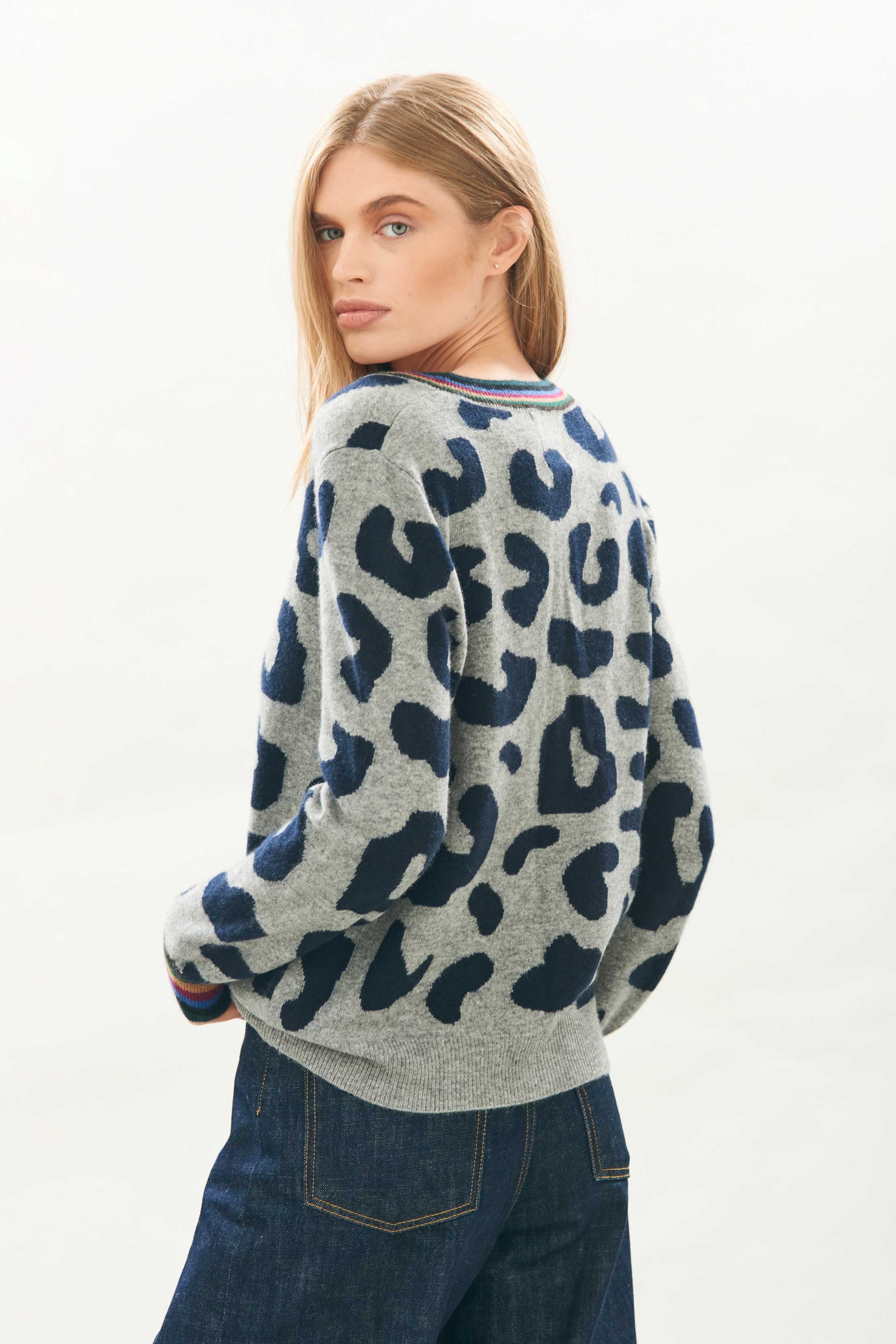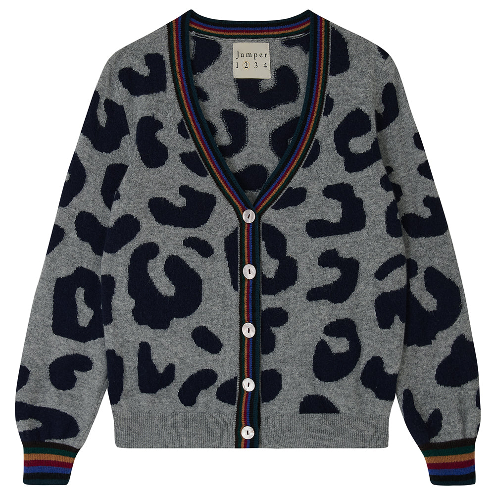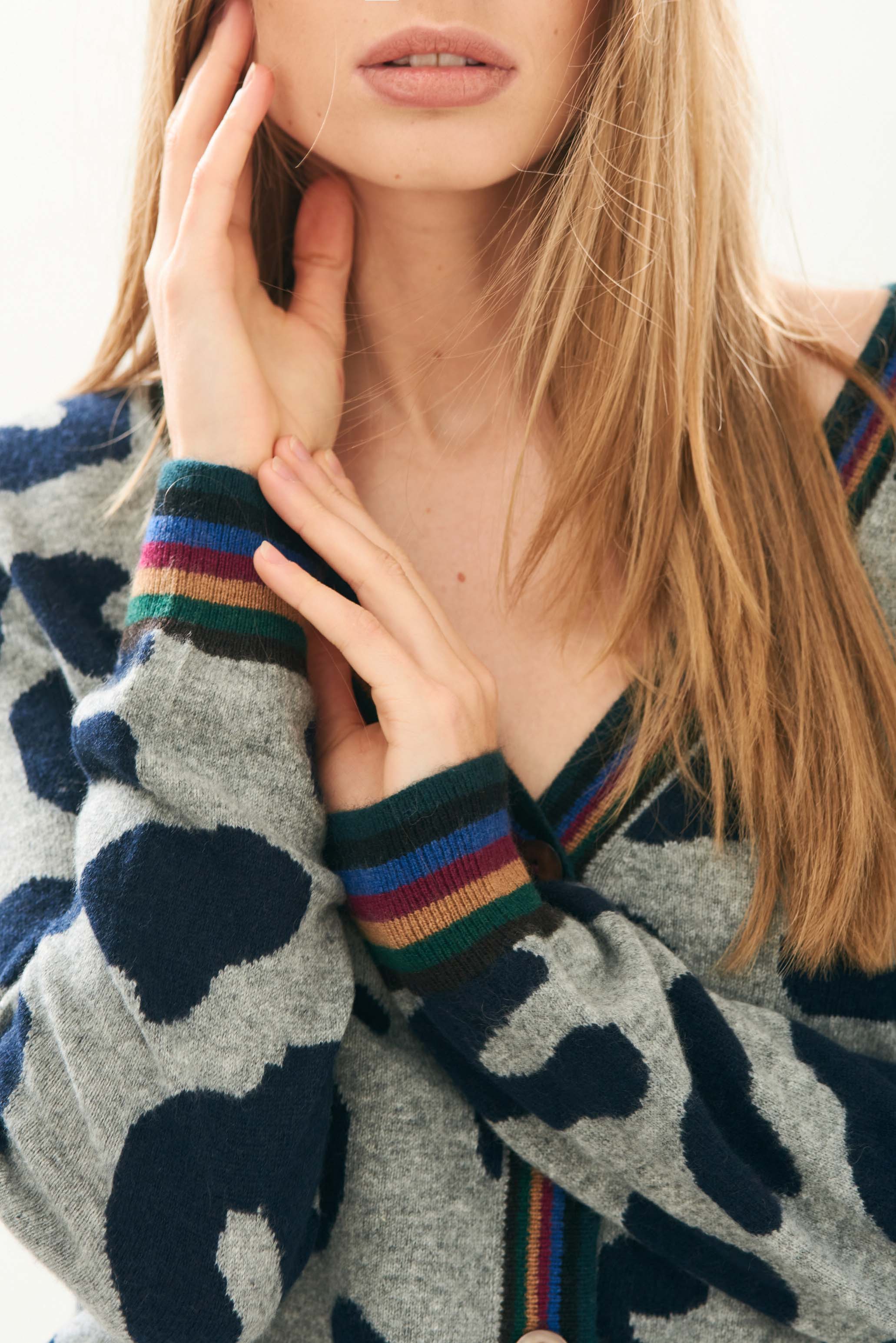 Jumper 1234 cashmere cardigan. Leopard intarsia vee neck cardigan in mid grey and navy with dark rainbow trims. Our best selling collaboration with Dilly Carter, reimagined for autumn winter. True to size and also available in a size 5.