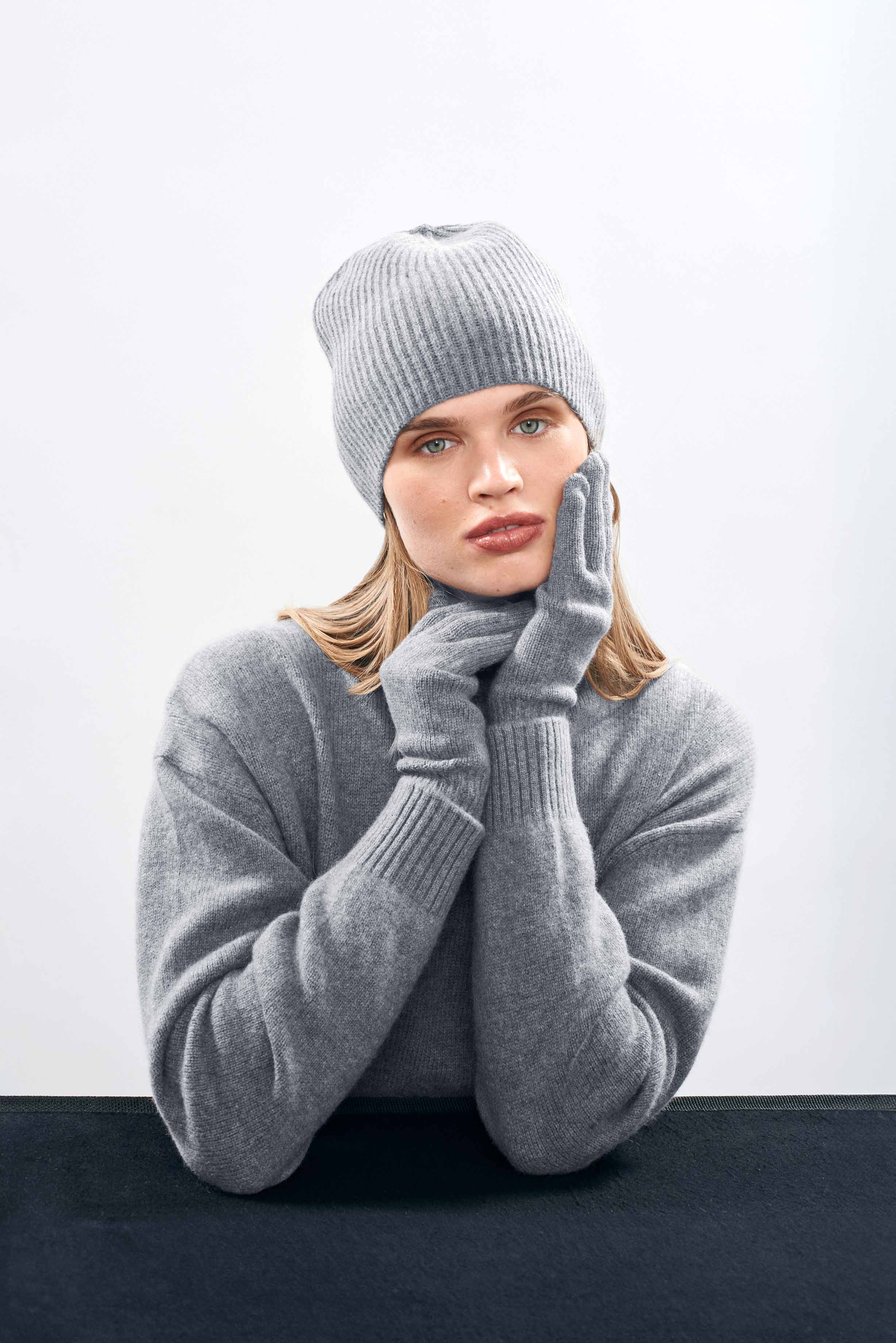 Jumper 1234 cashmere hat. Cashmere ribbed beanie in mid grey, available in 5 colours with matching gloves with or without fingers too!