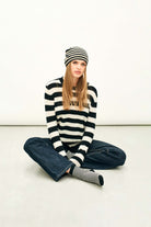 Jumper 1234 cashmere jumper. Black and stone stripe cashmere crew neck jumper, with distressed ribs. True to size, available in 4 colour ways and there are matching hats and socks too!