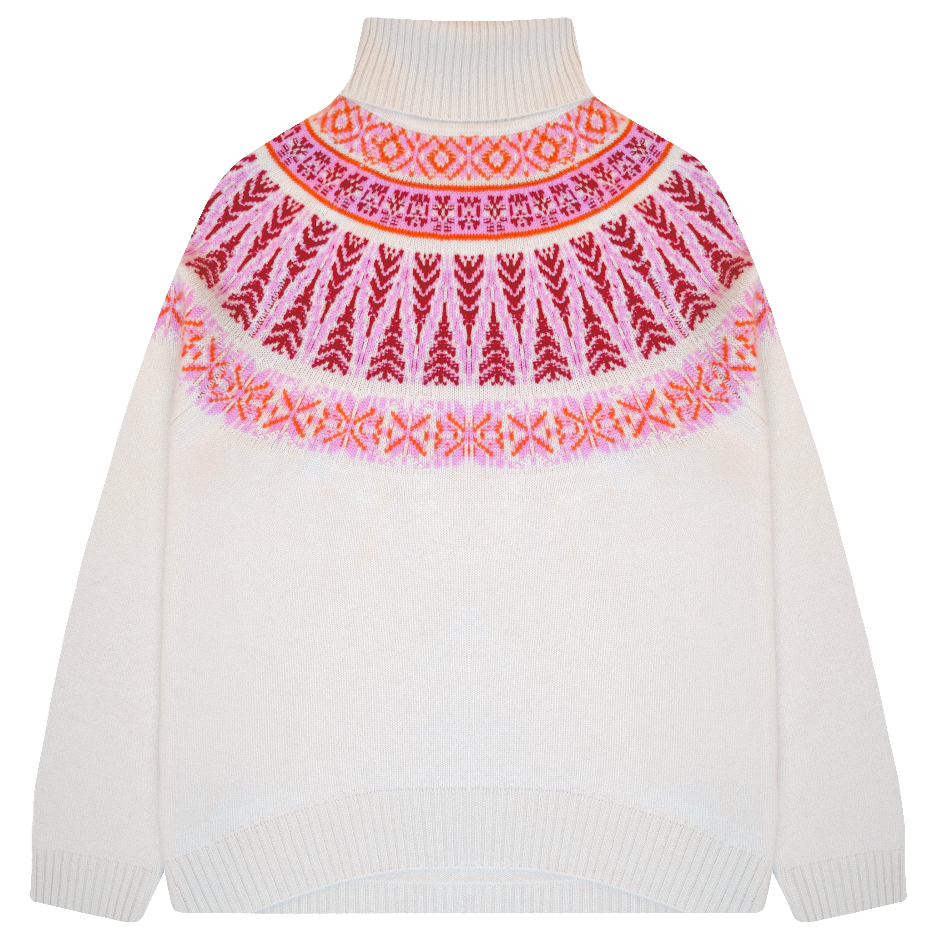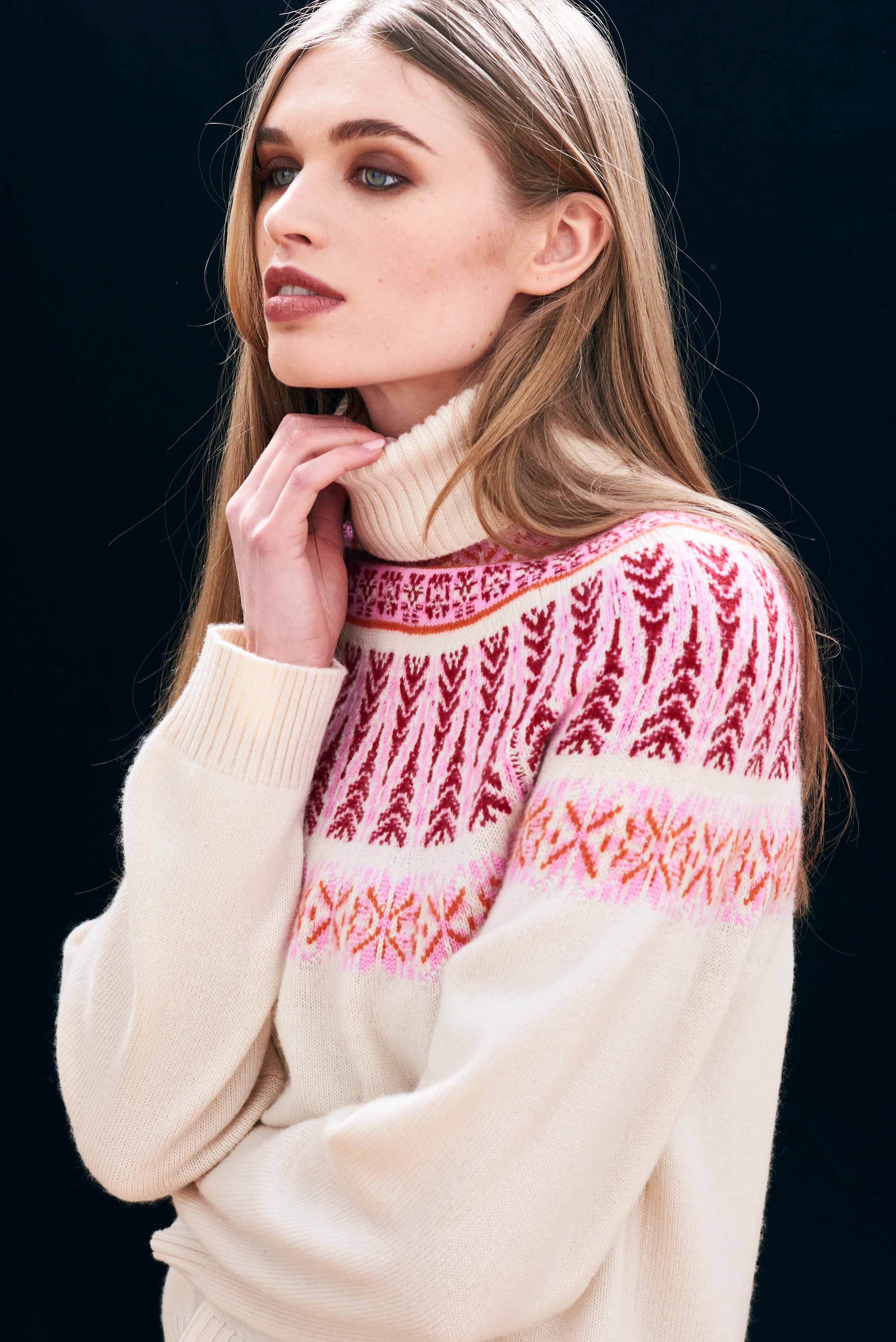 Jumper 1234 cashmere and wool jumper. Our cashmere and wool blend roll neck in oatmeal with a fabulous Fair Isle yoke in shades of red and pink. Generous fit and slightly longer at the back and also available in dark brown. We love this jumper!