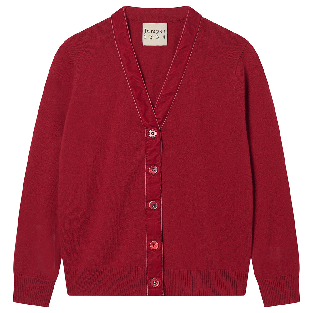 Jumper 1234 cashmere wool cardigan. Dark red vee neck cardigan in our fabulous cashmere and wool blend with matching velvet trim. Available in 4 colours, this is going to be one of our go to cardigans this season, it's a neat fit so do size up if you want a more boyfriend feeling.