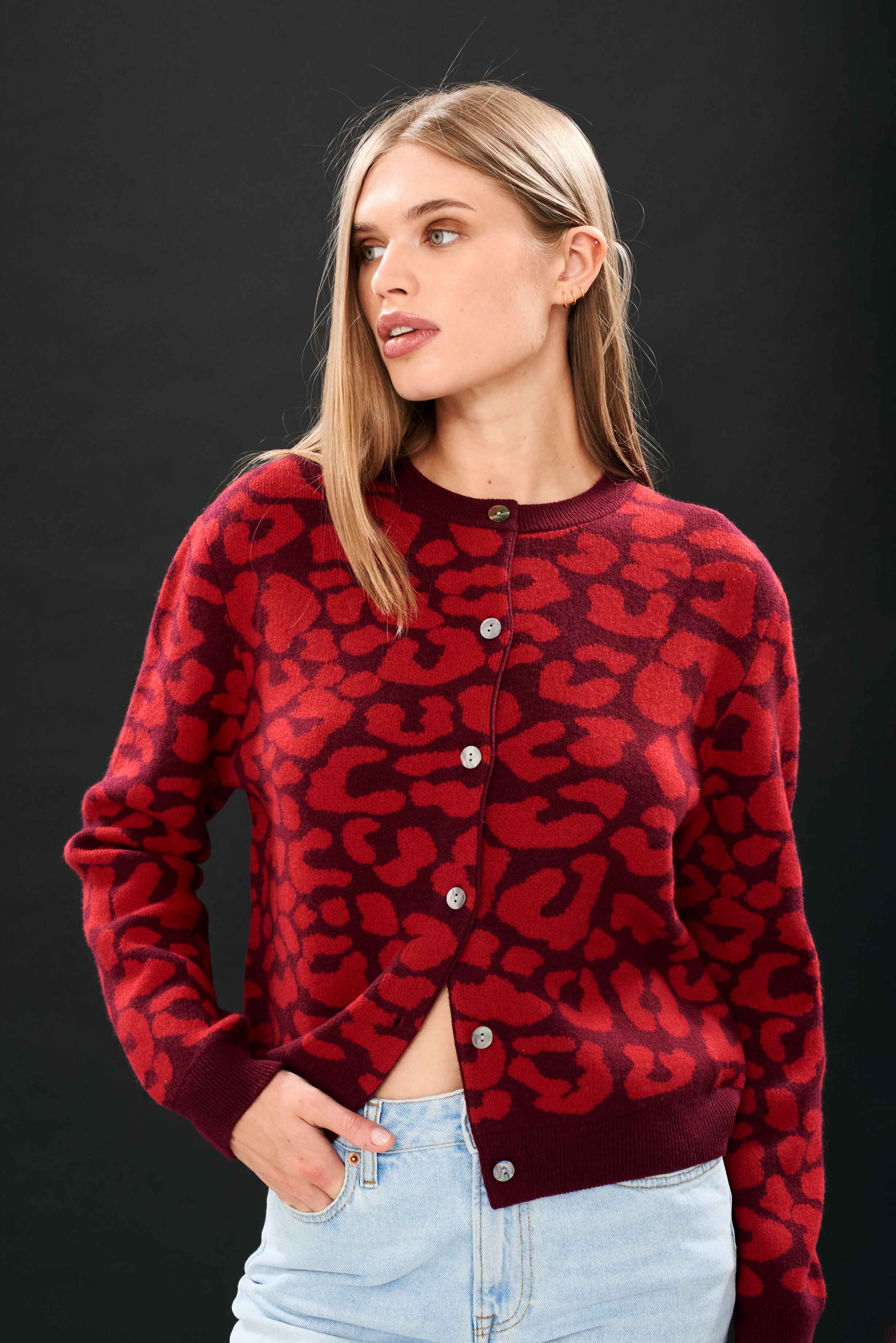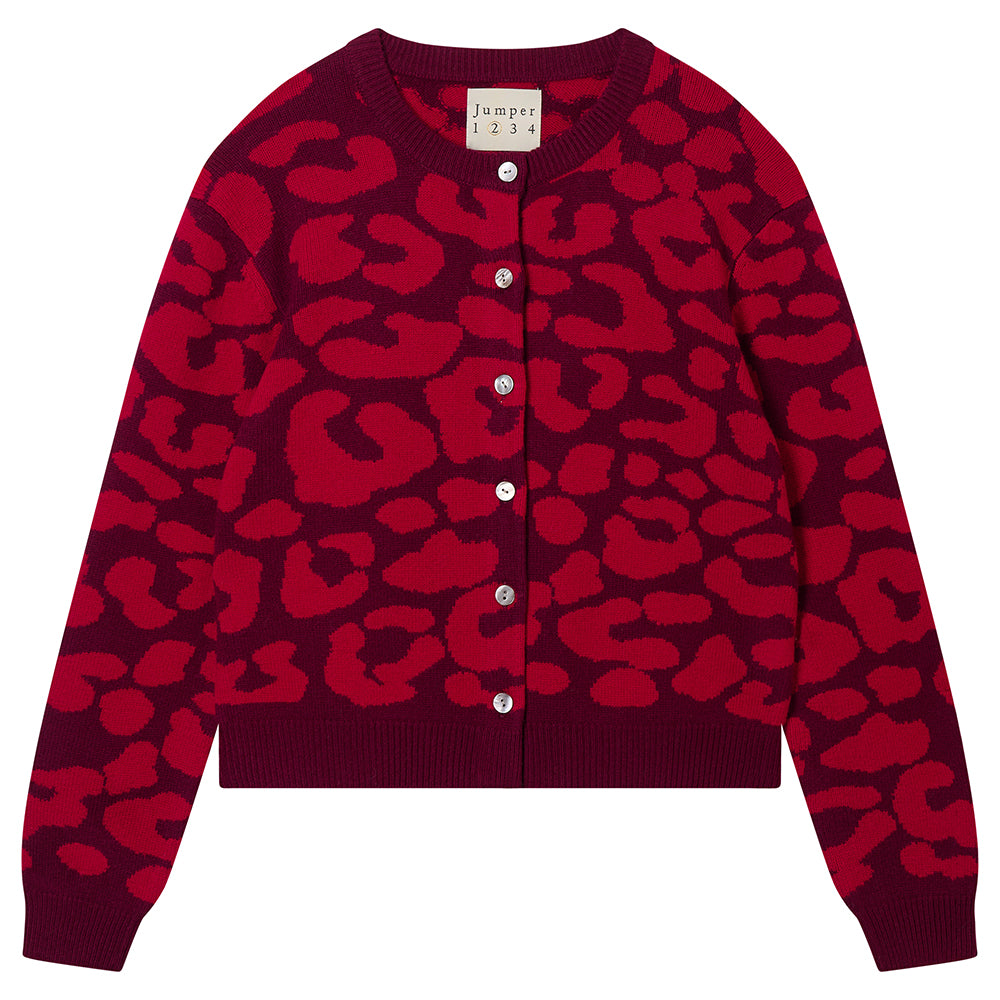 Jumper 1234 merino cardigan. Merino wool heavier weight all over leopard jacquard round neck cardigan in burgundy and red. True to size and available in 3 colour ways This is the first time we've offered 100% merino, and even if we say so ourselves it's pretty amazing!