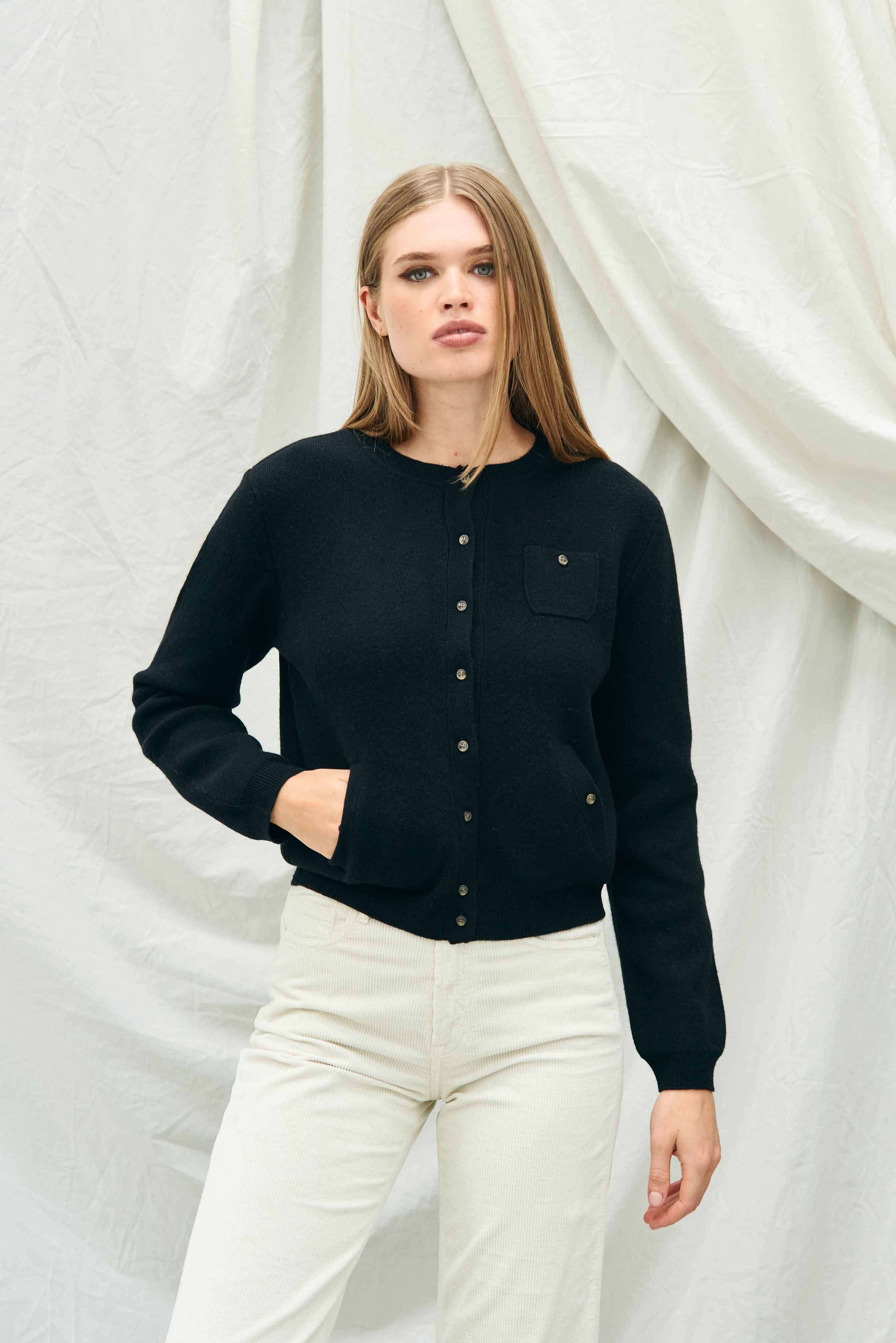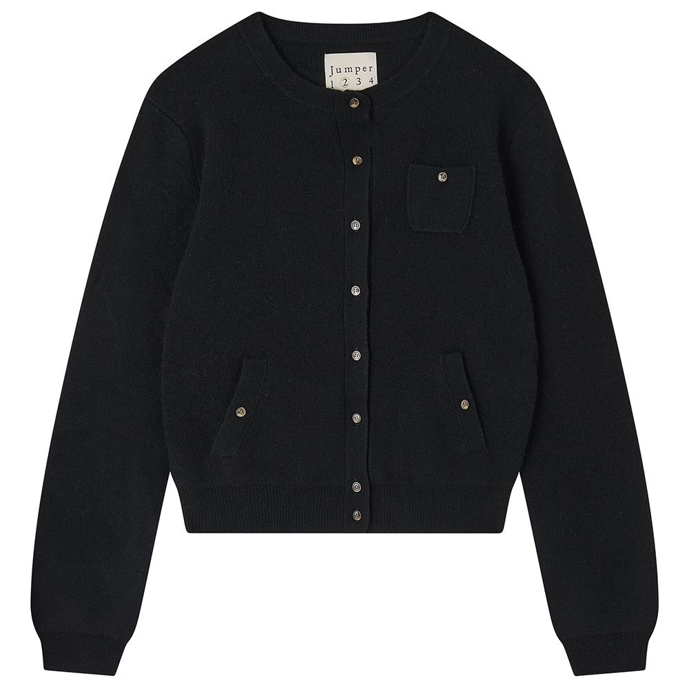 Jumper 1234 merino cardigan. Black merino wool crew neck cardigan with lots of pockets, all of which are useful! Available in 5 colours. It is a neat fit, still true to size, but size up if you want to wear it a little looser! This is the first time we've offered 100% merino, and even if we say so ourselves it's pretty amazing!