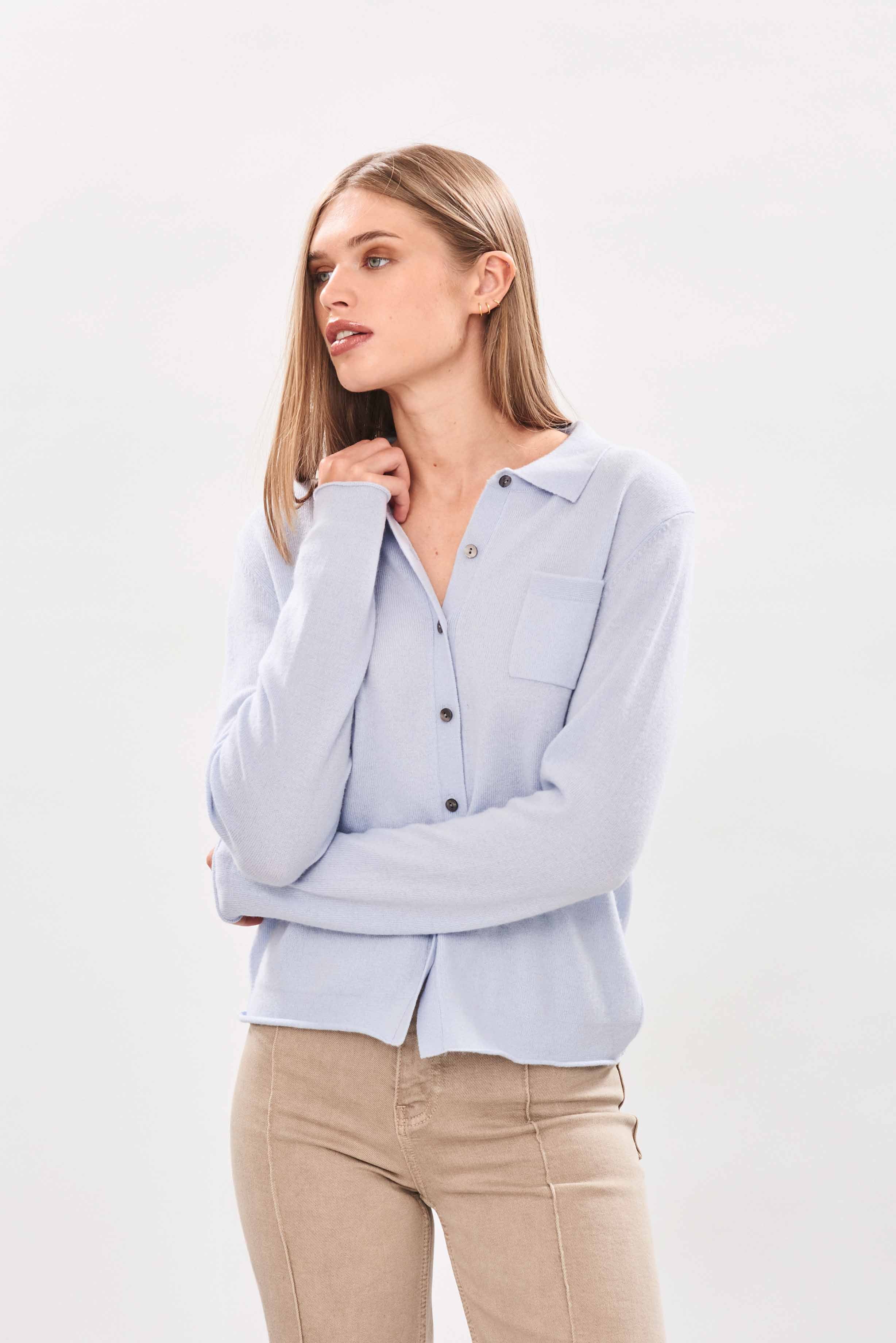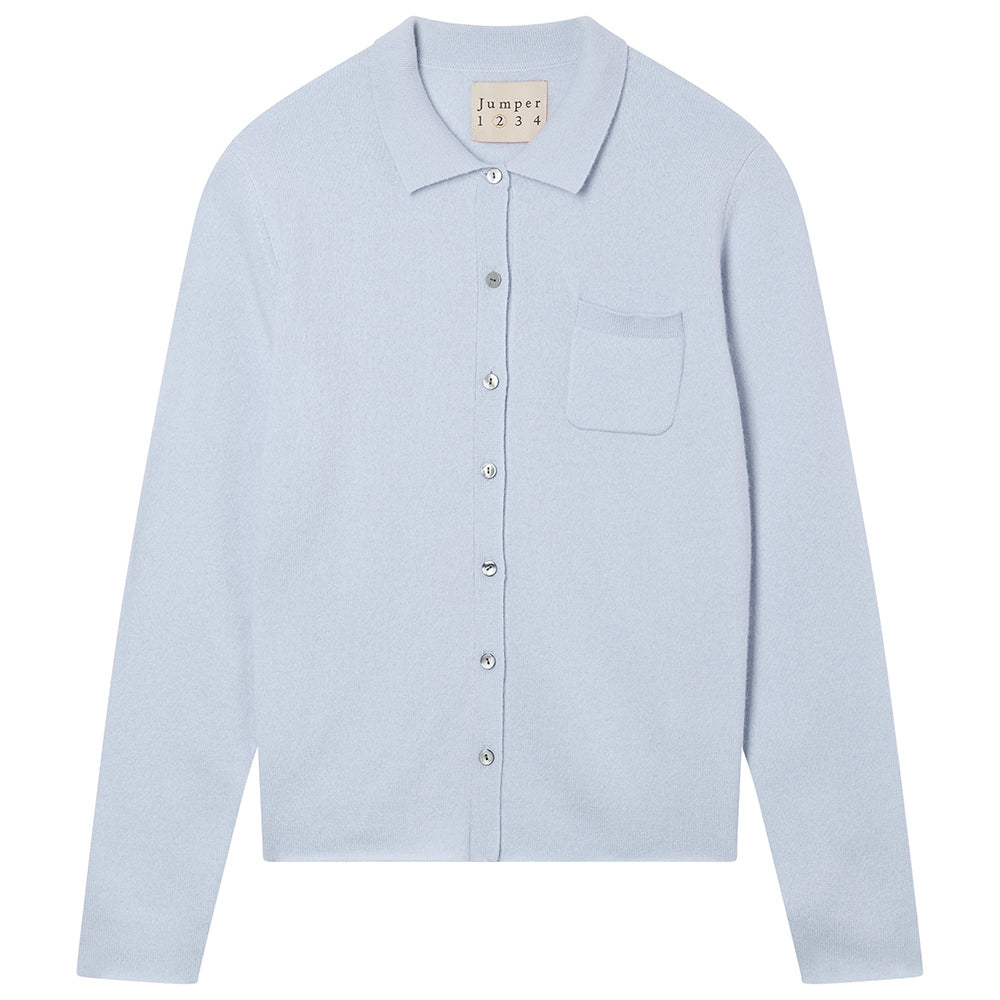 Jumper 1234 merino shirt. Merino wool knitted shirt in pale blue. Slightly fitted 100% merino wool button through shirt with a pocket, available in 5 colours. This is the first time we've offered 100% merino, and even if we say so ourselves it's pretty amazing!