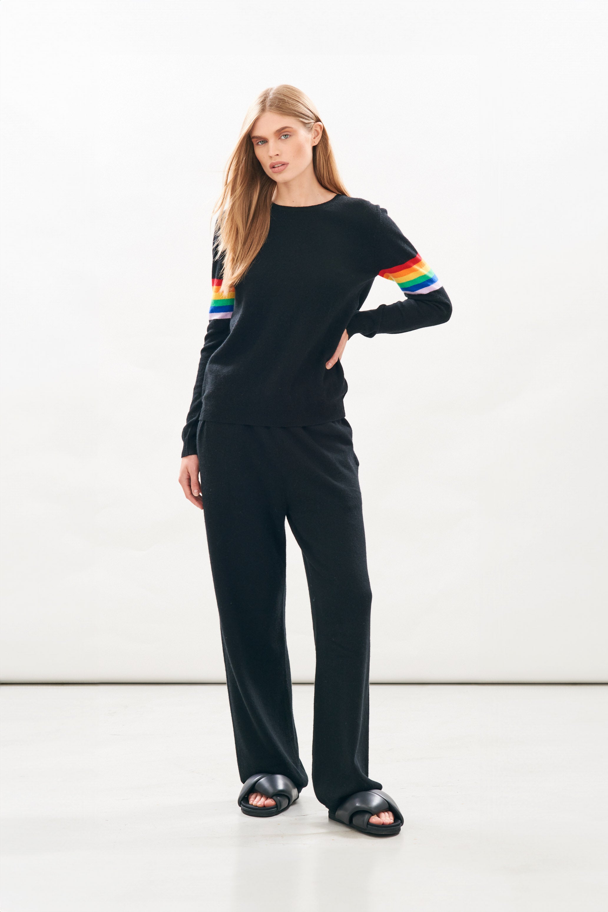Jumper 1234 cashmere jumper. Black cashmere crew neck with rainbow stripes on both arms. Classic fit and true to size, and available in a size 5 for the first time ever. Our first ever jumper design, loosely based on one Jane had in the 1970's, also available in oatmeal, mid grey and navy. AND it's an online exclusive, and it comes in a size 5!